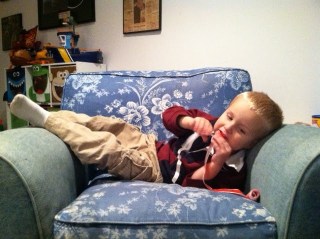 tonight’s deal was john needed to finish his dinner and his homework. if he finished his dinner and homework, then he got a fruit by the foot and to watch a “johnny show” before bed. immediately after he completed his homework he says, “ok, daddy, can i have one of those things?” he ran upstairs, got a fruit by the foot and came back downstairs. looks at kyle and says, “i got my snack and i’m gonna sit in your chair.” he then climbs into kyle’s chair and makes himself comfortable.