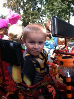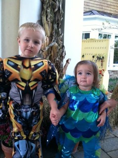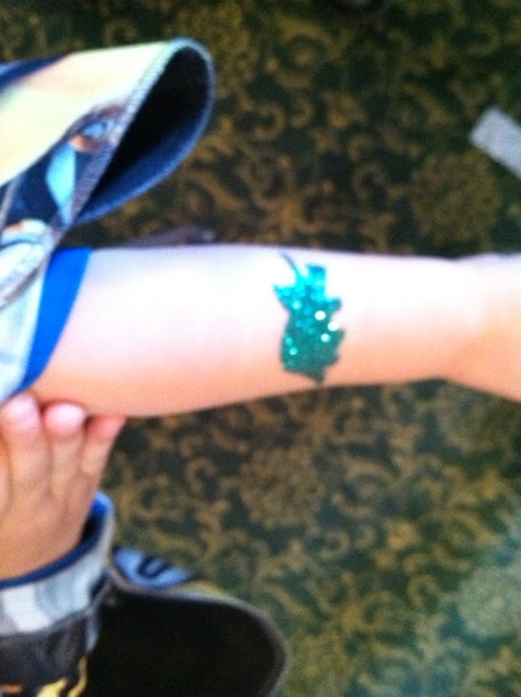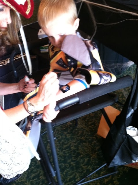 this year, the kids’ great grams or gigi (as we like to call her) picked out gillian’s glitter fish costume and found john’s bumblebee transformer costume. john was very excited to go to the halloween party. while gillian fell asleep in the car on the way down. they had a huge buffet, a dj, craft station, a tattoo station and hayrides. we got the kids fed immediately. once, john was done eating, he had daddy take him to the tattoo station to pick out a tattoo.