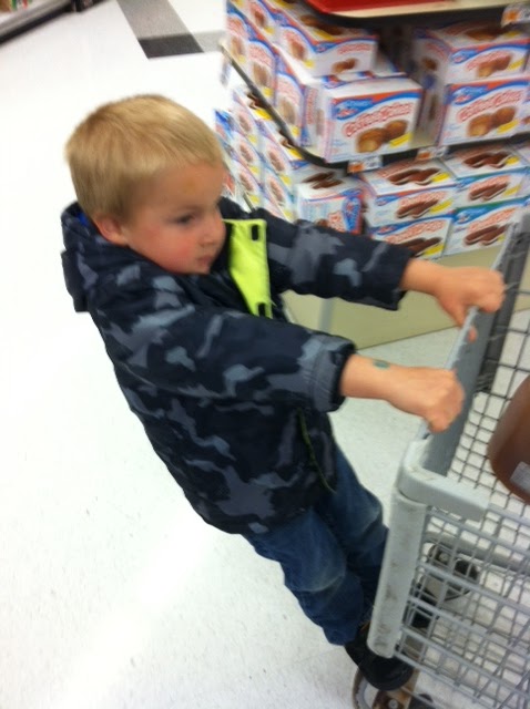after the cart tricks, we had john walk through the rest of the store. it was a little hard for mommy or daddy to push the cart. i was worried that he would just fall off. so he created games with the different colored floor tiles. we had to only step on the black or jump from one tile to the next.