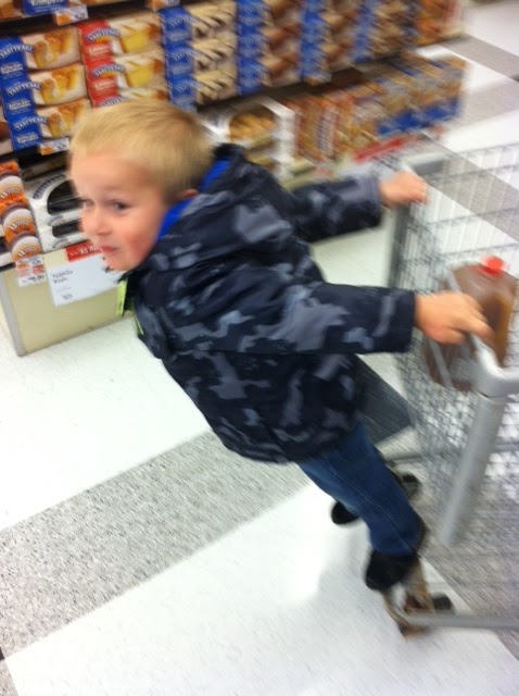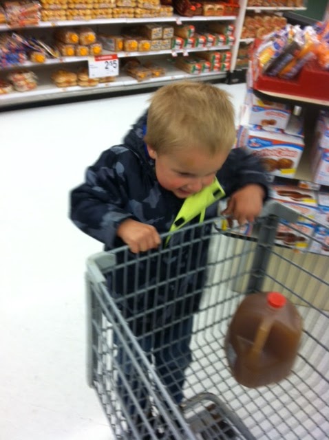 we headed over to the a&p to pick up a few things. in the parking lot, john went with daddy and i had gillian. most things turn into a competition with john, and there was a race for the front door. gilly and i had the handicap of putting gilly in the shopping cart. so the boys won this time. i walk in the doors of the store, and there was john with a gallon of apple cider. “we won. and i got the cider.” john then hands me the cider and jumps on the back of the cart.