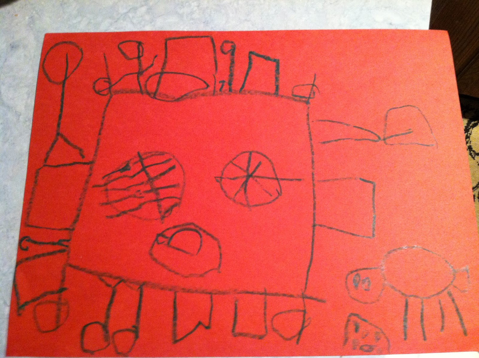the picture above was described to me as follows: this is our house on thanksgiving. everyone is sitting around the table. that is duncan with dog food (the figure in the right lower corner). the table has all the food we will eat for thanksgiving. this is turkey (the bottom circle). that is pumpkin pie (the circle to the right). and that is pizza (the circle to the left).