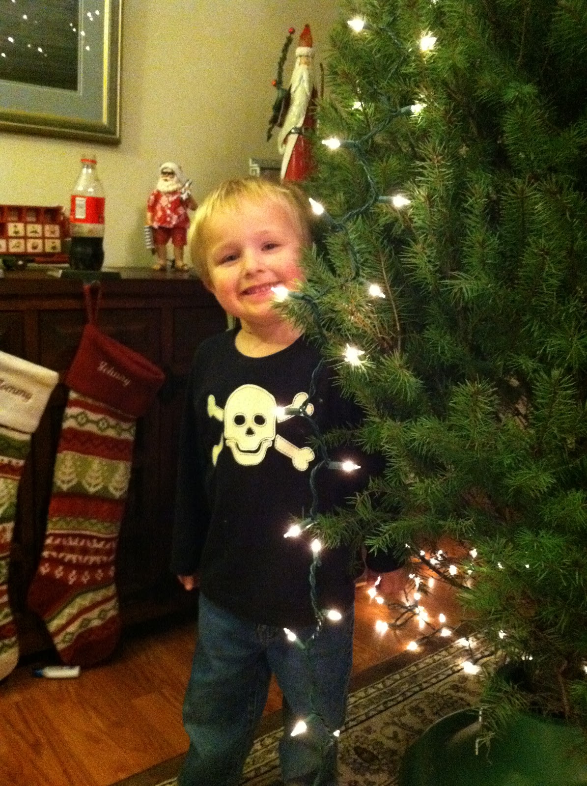 we bought our christmas tree this weekend, with the intentions of decorating it yesterday. unfortunately, we didn’t get a chance to work on the tree yesterday. so we decorated tonight. i am a little anal retentive about the lights. daddy understands and left me with john to put the lights on the tree. before we started, i gave john the game rules for putting up the lights: