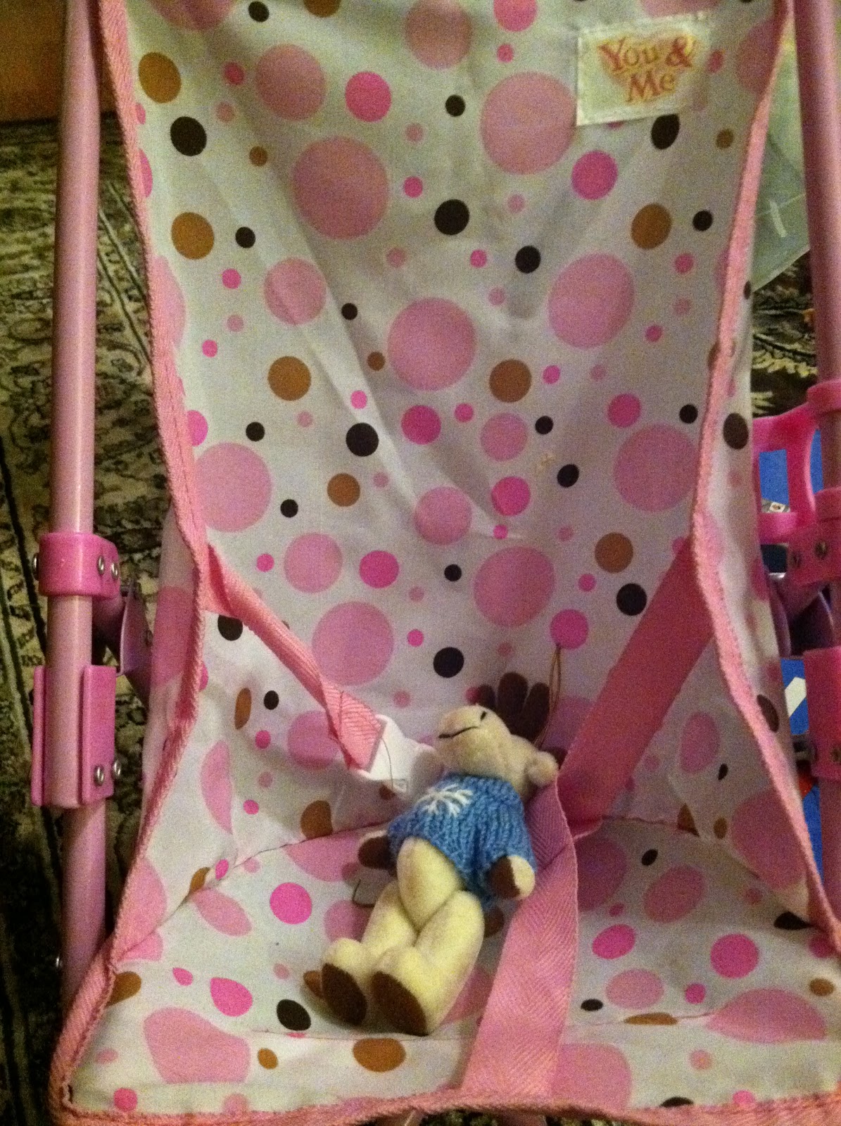 | gillian took one of the moosie ornaments and pushed it around in her stroller |