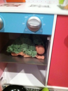 i was curious, so took a look around her kitchen. the microwave was empty. so was the cabinet under the sink. unfortunately, i found another baby in the oven. i personally think the best part is that she considerately gave baby a blanket. you know, in case it got cold in the oven.