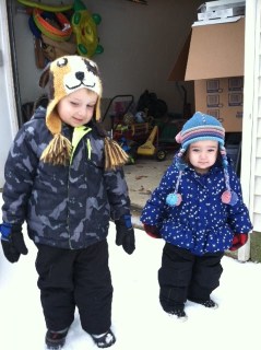This winter has been pretty mild. We saw a little bit of snow in October but that has been it. Last night it snowed. I didn’t tell John about the possibility of snow. I didn’t want to disappoint him. He woke up this morning and came running to find me. “Mommy! Mommy! It snowed!!!” He was so excited. He found Daddy and made him look out all the windows to see the snow. When Gillian woke up, he saw her and said, “Mommy? Did you show her the snow?” I had a hair appointment, so I left the kids with Daddy. When I got to Point Pleasant and it was snowing, I text Daddy to let him know that he should try to get the kids outside to play. I was afraid that it would start raining and they would get to enjoy any of the snow. Daddy took the kids out for a little bit.