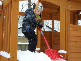 John and I got to play outside while Gillian was napping. Our goal was to clear some of the snow off the deck for Duncan. That didn’t take long and we got to play for a little bit. John wanted to go by his swing set. We walked all the way there, and he climbed on top. “There is snow up here?” Silly boy. He sent me back to get his little snow shovel. He had to clear off his swing set.