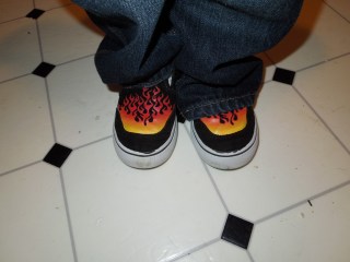 John got new sneakers for Christmas. They are black with flames on them. He thinks that they make him faster.