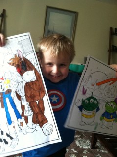 This morning he woke up and found Daddy playing video games in the basement. And that’s where I found them this morning. I woke up Gillian and got everyone upstairs for breakfast. During breakfast John says, “I know! Let’s play school.” We played school last weekend too. Basically it is just an opportunity for John to boss Gillian and I around. Plus he always has art and I get to color too. So of course we played school. I love to stretch the kids imagination any time possible.