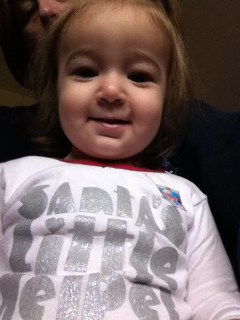 We go into the living room and the art supplies are all over the coffee table. He is sitting on the love seat and Gillian is standing on the window seat behind him. I asked him why Gillian was in the window and he says “Cause that’s where I have the little kids stay.” I got Gillian out of the window seat and we all sat in circle time on the rug. He starts with “Today we are going to talk about pom-poms. Pom-poms are really soft. Feel them.” And he proceeds to have Gillian and I touch the pom-pom. He then says “They are soft not sticky like stickers.” And that concluded the lesson on pom-poms. He then asked us what we had for show and tell. I was totally unprepared for show and tell. Gillian had a baby (no surprise there). Luckily for me, John supplied me with a blanket that I could use for show and tell. After show and tell it was art time. Yay! I love art time. We got to work on a new picture. Gillian would steal a couple of markers and just walk around the room. Mommy is very lucky that Gillian has not figured out how to get the top off of a marker yet. We got to color for a little bit, while the teacher got to put stickers in his sticker book. After coloring, John decided it was time for free play and we got to go downstairs to play. Before going down stairs, both Gillian and I got stickers because we were really good in school today.