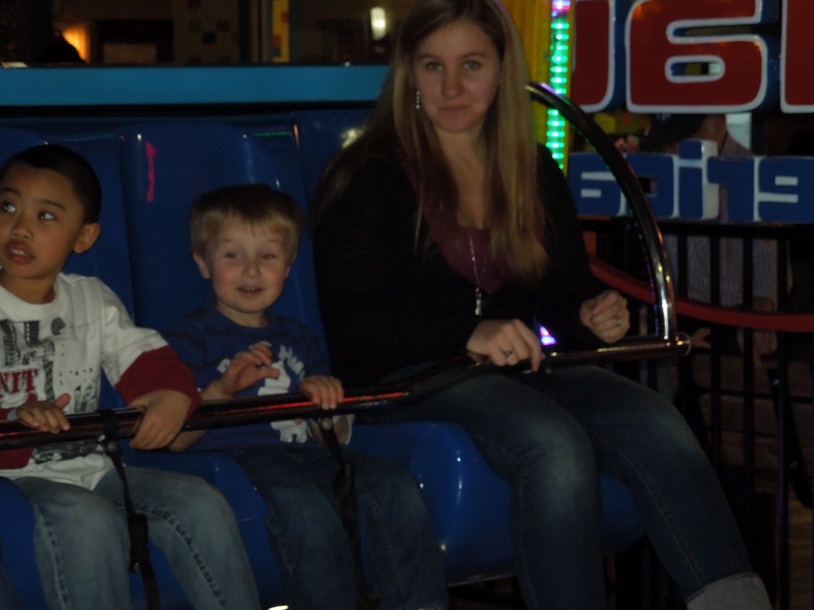 The first ride was called “Kite Flier.” They had to lay down and they would go up and down. Daddy said that at first John was a little nervous, but by the end he was giving Mommy a little wave. This picture is from the end of the ride. I know he loved it, because as soon as he was done, he was ready for the next ride.