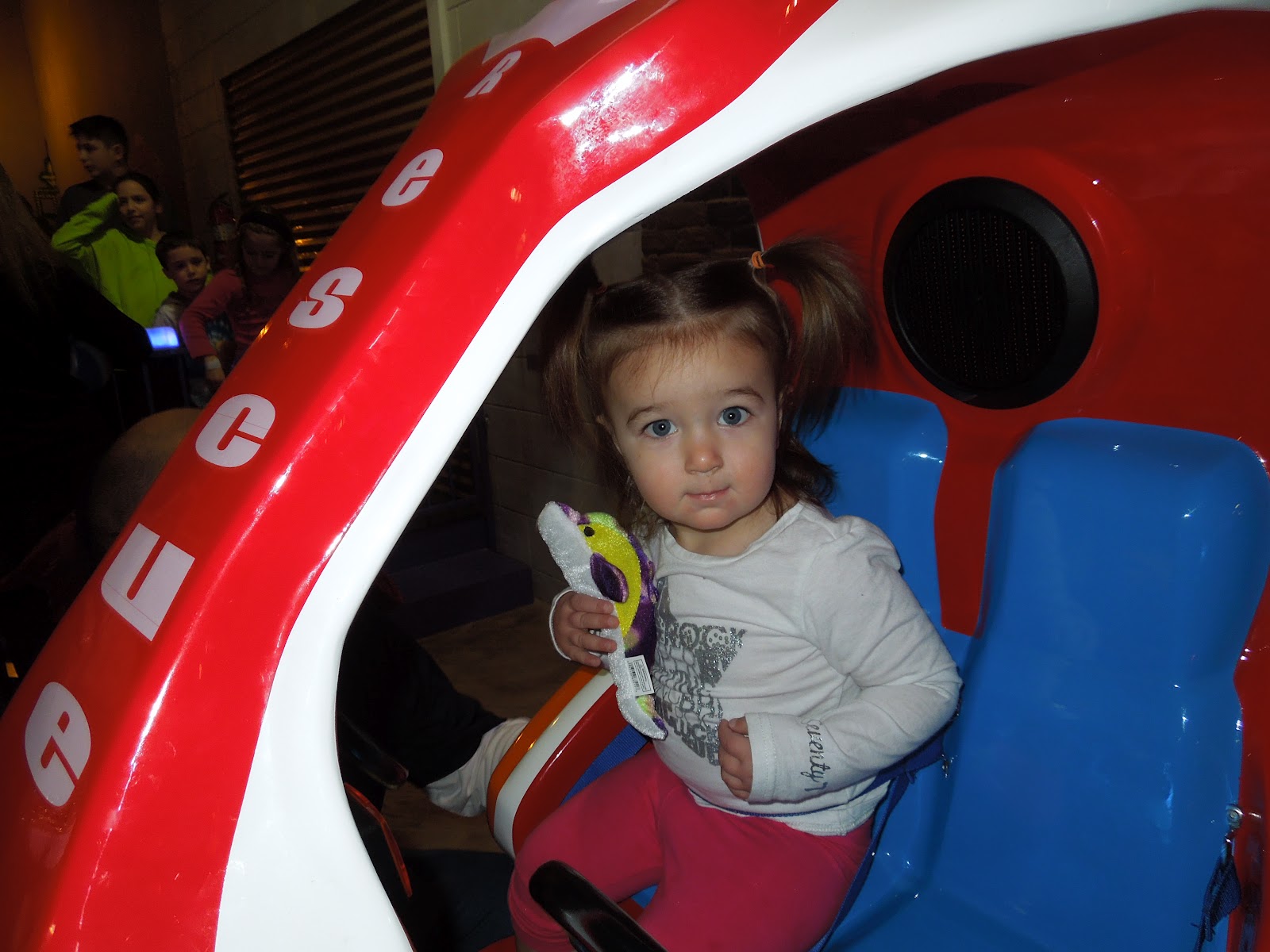 While John and Uncle T were on the dragons, Gillian got to go a little ride. She went on a helicopter and a fire engine. She was a little leery at first, but loved it in the end. She is snuggling a dolphin that Uncle T won for her. We named the dolphin “Phin.” I did get to watch the dragons go around, and most of the time, we saw John in the dragon smiling and laughing. A couple of times, all i saw was John’s feet in the air. As the dragons were slowing down, I saw one green dragon still spinning and spinning. Of course, that was Uncle T and Johnny.