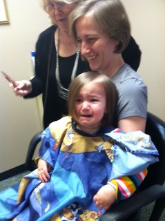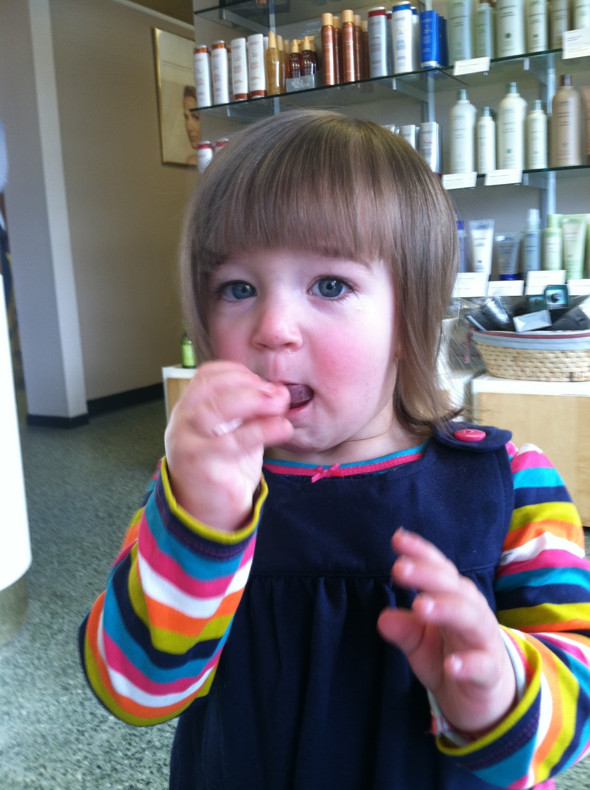 Aunt Betty was next for her haircut and then it was Gillian’s turn. Gillian was a little nervous when we sat down. She started to kick and squirm when Leslie put on the cape. We did get a little cape on her and she just started to cry before Leslie even got close to her with the scissors. Leslie cut her bangs and Gillian calmed down. She actually giggled a little bit. Thankfully this was not Leslie’s first little girl in the chair and she was extra sweet to Gillian. Gillian was awarded a lollipop for her bravery. And now Gillian looks like a completely different little girl.