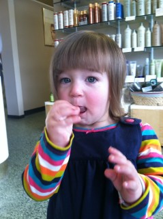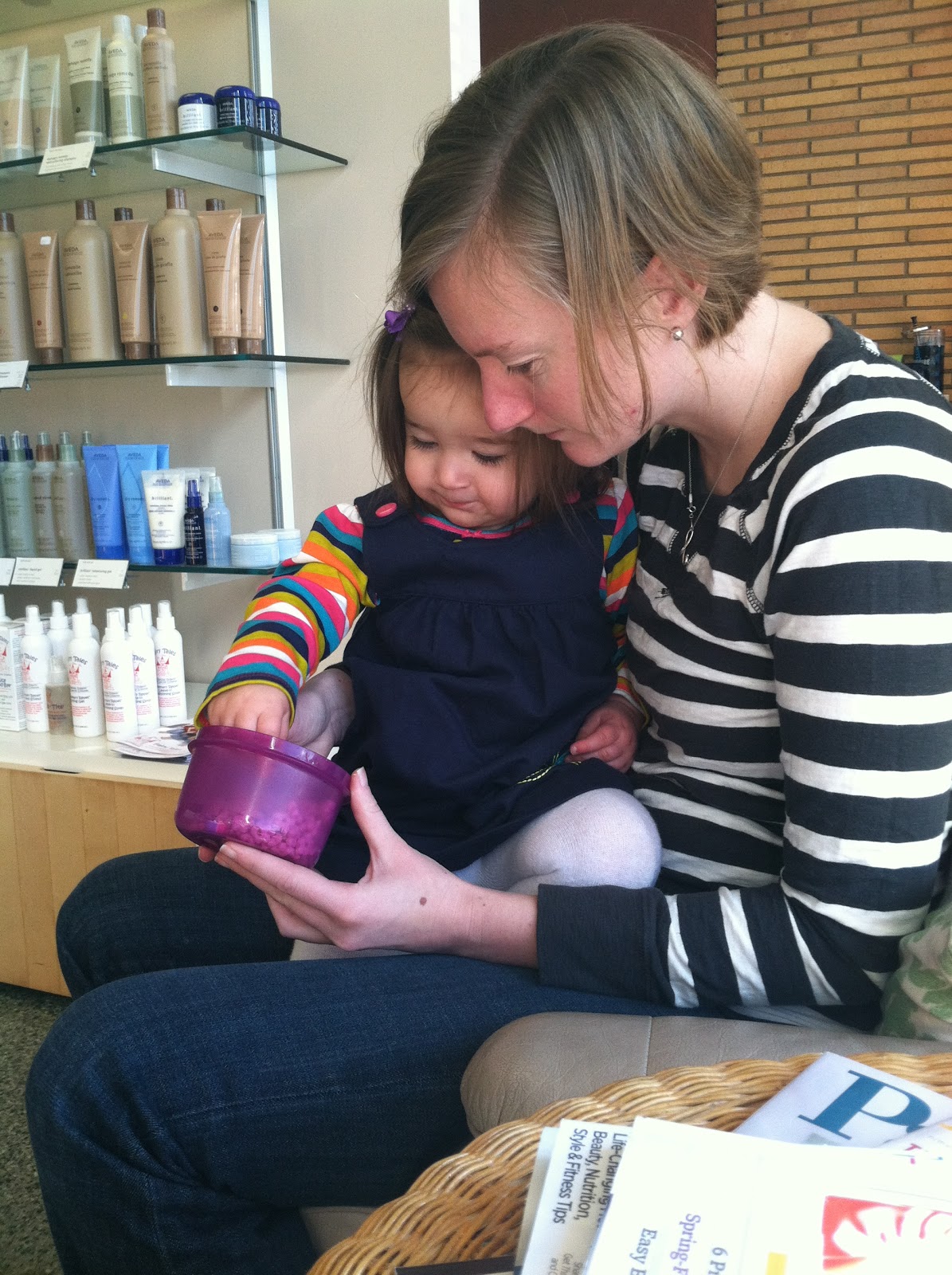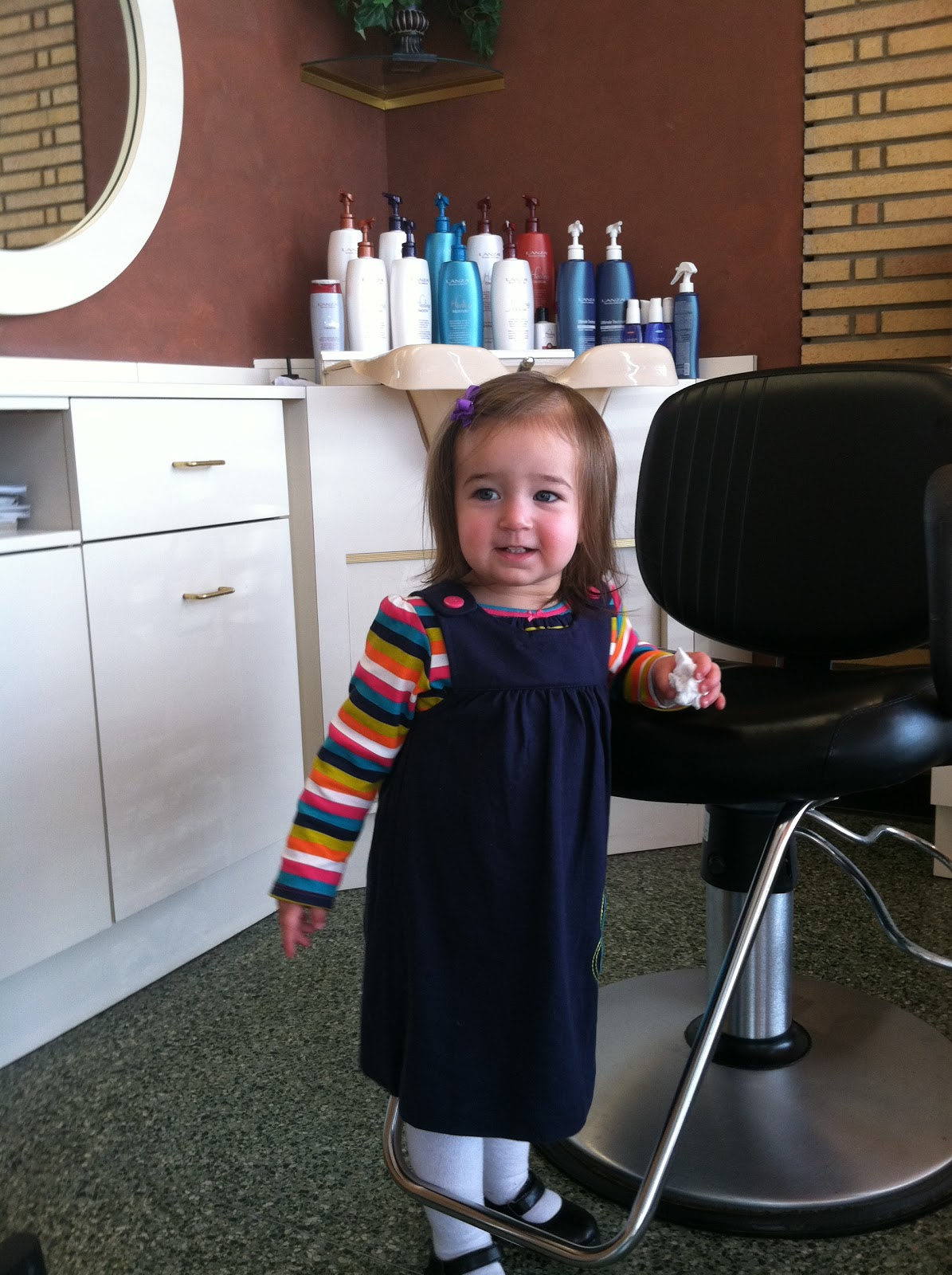 After Grandma got her haircut, it was time for Mommy to get into the chair. Gillian got very upset when she saw me get my hair washed. After a few minutes she realized that Mommy was not getting hurt and she stopped fusing. While I was getting my haircut Gillian was getting more comfortable in the salon. She was walking around and saying hi to everyone.