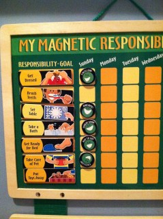 Before Christmas, one of the ladies from work gave me a few toys for the kids and two Melissa & Doug Chore Charts. I honestly thought when she gave them to me that it was a little soon to give John a list of chores to do on a daily basis, but both Daddy and I loved the charts. We finally put them up today. I know we are total slackers. Anyway Daddy hung them up with John. They picked a handful of “chores” for him to complete. 1) get dressed, 2) brush your teeth, 3) take care of pet, 4) set the table, 5) take a bath, 6) put toys away and 7) get ready for bed. Daddy told John that if he did his chores every week and got a minimum of 25 smiles he could earn a $5 allowance. Daddy explained to John that he could use the money for whatever he wanted. John went to his friend’s birthday party on Saturday and really liked the super hero toys we got for his friend. I was upstairs folding laundry while the boys were busy hanging up the charts. I could hear John from downstairs saying “OK Daddy lets do our next chore. We got lots of stuff to do Daddy!” I am very glad that John is excited about helping and trying to get his chores accomplished. I didn’t earn an allowance when I was growing up, but I hope to instill in John a respect for money. I think he is already beginning to see that it will take him a lot of work to earn those two toys he wants.
