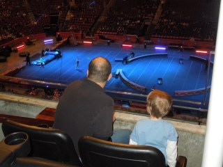 John’s favorite acts came at the end of the night. Just like Daddy, he loved the motorcycles and the globe of steel. He will tell you “they got eight motorcycles in the circle. First they got four and then seven.” He also loved the teeterboard tricks. There were two rings with the teeterboards. They would make one guy go up in the air and he would land on top of some one’s shoulders and they would go higher and higher. He loved it. He was sitting behind me at the time, and all I could hear was “that was awesome!” or “Wahoo!!!”