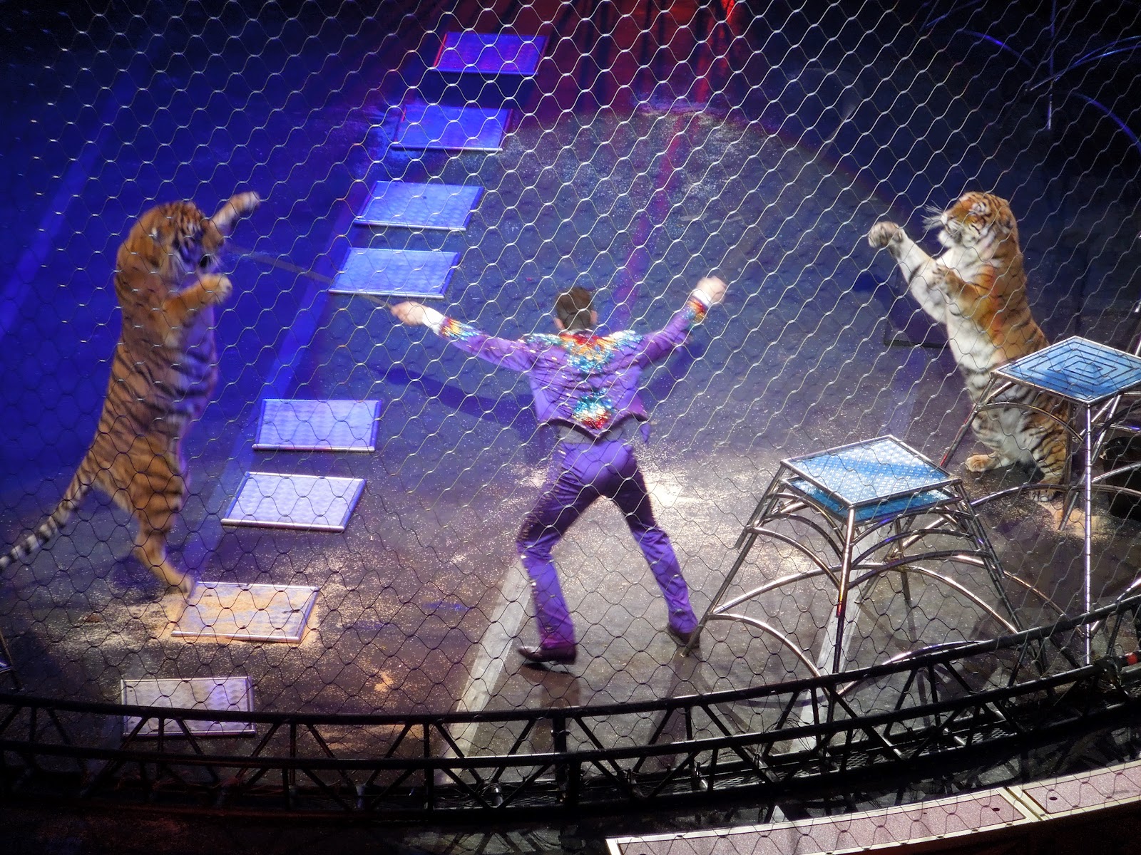 After the opening song, the riders of the wind came on. They did tricks on horseback. I’m not so sure that John was impressed with the horse and riders. I think he was still excited to know that he could have as much popcorn and soda has he wanted. After the horses, they set up the ring below for the tiger and lions, they had a motorcycle on a high wire. The motorcycle was really cool, but unfortunately it was on the other side of the stadium. It was hard for John to see and he probably would have loved it if it was closer. The big cats were up next. I think that Mimi was a little afraid that they would attack the trainer. The cats were well behaved, although one named Princess did not want to do all the tricks. She barely cooperated and was the first one back in the cages. But don’t worry no blood was drawn and the trainer survived!