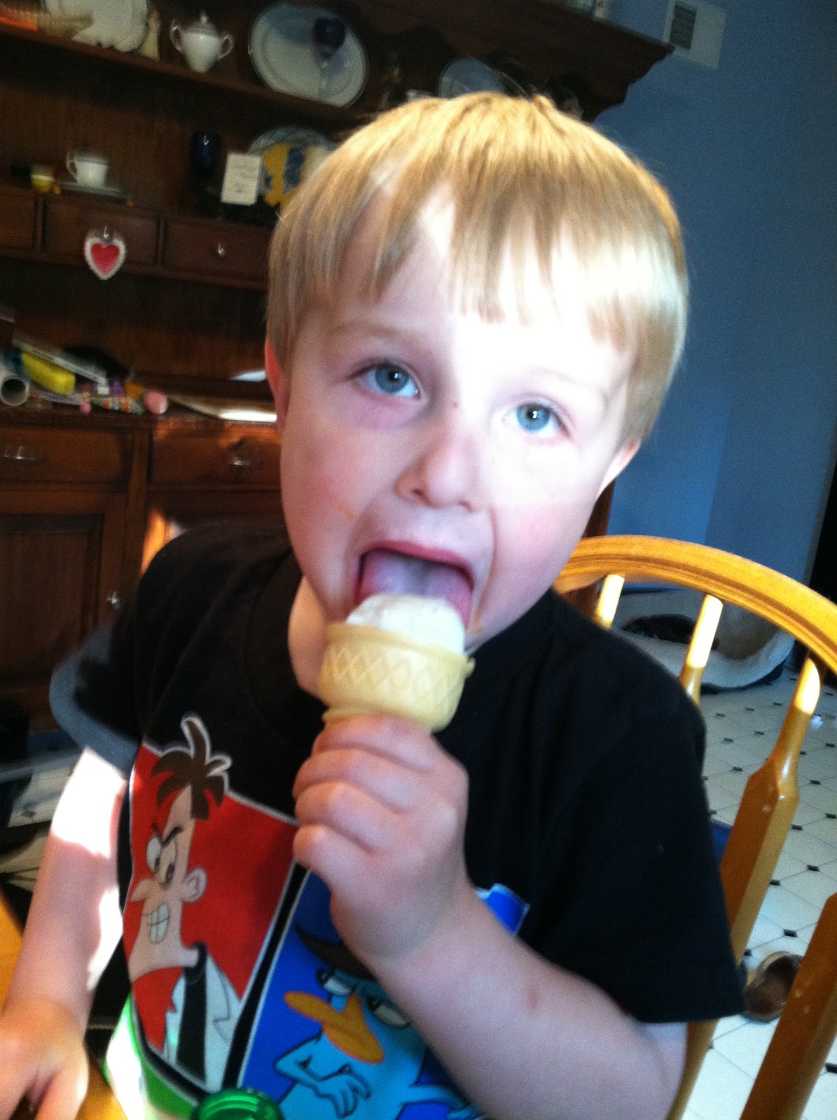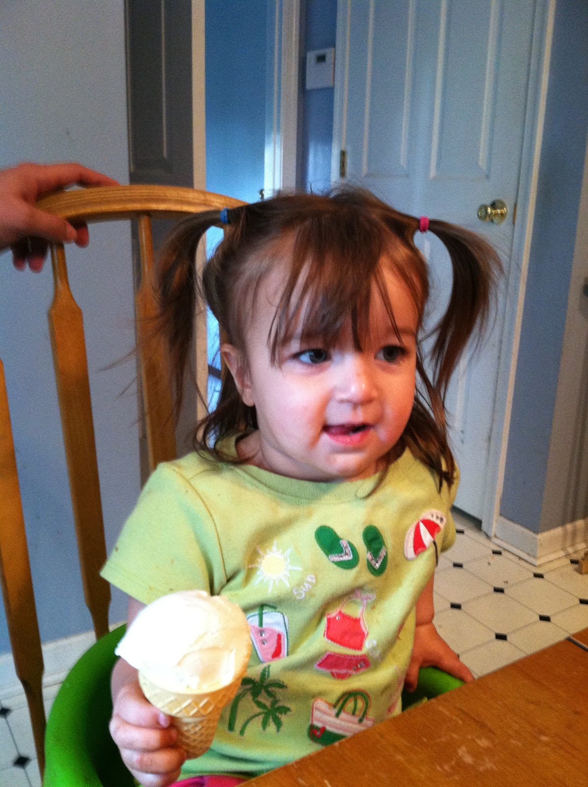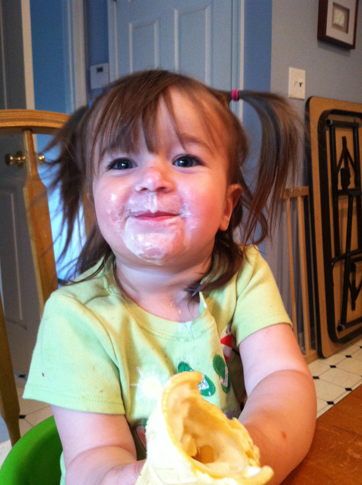 After dinner, I decided to give the kids a treat…an ice cream cone! It was such a nice day and I knew they would enjoy one. It was Gillian’s first time having an ice cream cone. She was a little shy at first, and was a little afraid to lick the cone. But she got over that quickly when she realized it was yummy.
