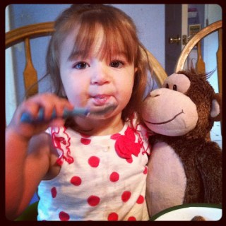 Gillian discovered Cooper this morning. She loves the monkey. John and Gillian decided that Cooper needed socks on this morning. And Gillian had him join her for breakfast this morning.