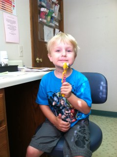 We had some down time in the exam room while we waited for some paperwork to be filled out. John sat in the doctor’s chair and checked out all the tools on the table. He loved playing with the doctor’s reflex hammer. It was shaped like a dinosaur. John said “It looks like a dinosaur. But it has a long neck, but long-neck dinosaurs don’t have spikes on their neck. It kinda looks like a dragon. Mom, you know what kind of dinosaur it looks like?” I was completely intrigued by his whole thought process here. Of course I said no, what kind of dinosaur does it look like. He says “Amargasaurus!” I didn’t know if that was true or not. I had never heard of an Amaragsaurus before (in case you are interested, check out this link to learn more about the Amargasaurus). But he does know his dinosaurs. I did get a picture of him holding the reflex hammer.