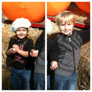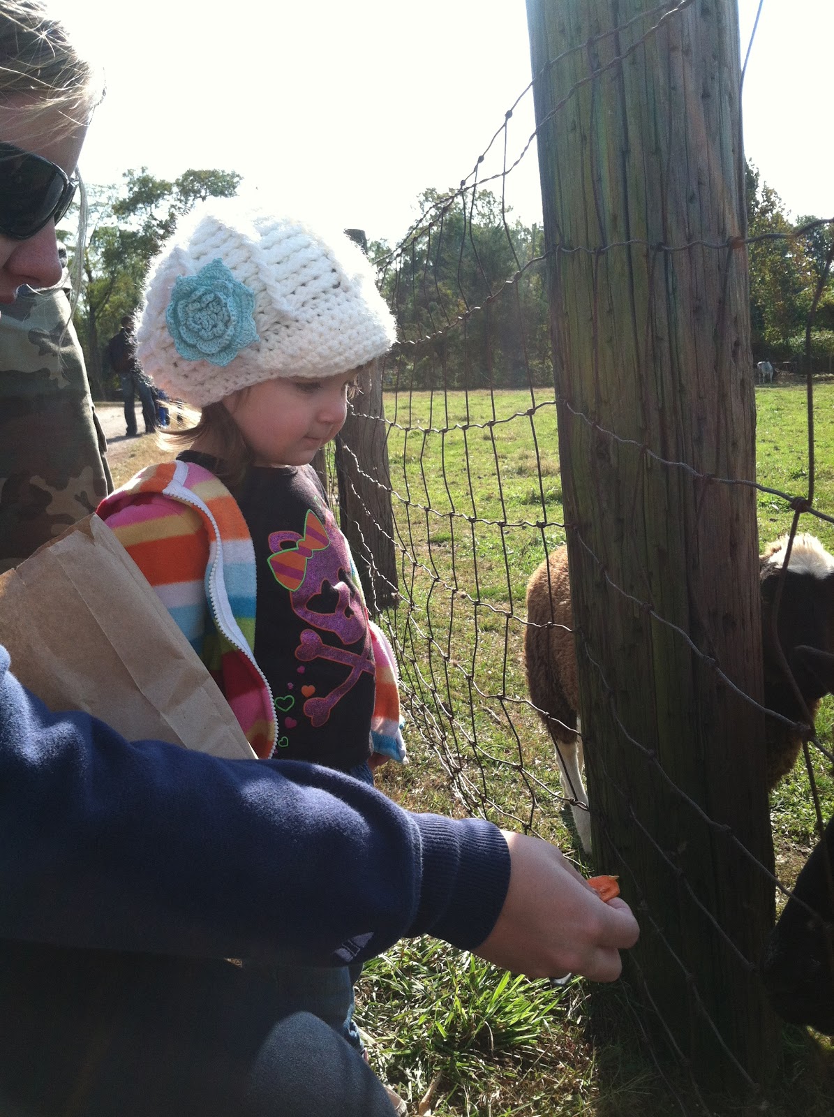 John started the quest to find the perfect pumpkin. He used a lot of the same critera as he had last year (check out pumpkin pickin from last year). It had to have no holes, a stem, round and not too dirty. After some pretty extensive searching, John found the perfect pumpkin. We headed up to pay for our pumpkins and decided to stop to feed some of the animals. John was not too excited about feeding the animals. He didn’t like them to eat out of his hand. Gillian, on the other hand, loved feeding the animals. She was very particular about what animals got the carrots she had. She also liked talking to the animals and would say “Hey! Hey!”