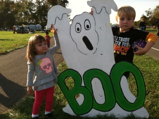 After nap time, we headed to Thompson Park Day. I did not realize that it was that big of an event. We got there and the park was full of cars and people. They had rides, activities, races and all kinds of fun for the kids. We immeditely ran to Aunt Betty’s Auto Zone. The Auto Zone had big wheels for the kids to ride, an obstacle course and some building blocks. John and Aunt Betty ran thru the obstacle course a couple of times and then they built a little building out of the building blocks. Gillian got to knock it down. After visiting Aunt Betty, we went to see a magic show. John loved it. He giggled and was surprised with all the simple magic tricks. Gillian got a little antsy, so we moved on and walked around some more. We tried to get John in one of the races for his age group, but we were just a few minutes too late. But the ladies running the races still gave John an inflatable ball which was the participation prize. We walked around some more, and John and Gillian both got to talk to the pumpkin head man walking around on stilts and the raccoon too. We were only there a short time (today was just a busy day), but we will totally make an effort to get to next year’s Thompson Park Day.