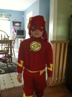 So the Governor postponed Halloween until Monday, however our town cancelled Halloween on Monday. On Monday, Tinton Falls still had about 20% of the town without power plus the department of public works did not have time to clean the brush or branches up. The mayor deemed it unsafe for the kids to go trick or treating. The kids school reopened on Monday, and asked that all the kids wear their costumes to school today. John was so excited to wear his costume. He dressed as Flash this year. In case any of you forget, John is super fast! And since Flash is the fastest super hero around, it just made sense for John to dress up as him for Halloween. Gillian was a beautiful lavender fairy. She loved being a fairy, but I think this may be my last year to pick Gillian’s costume. I packaged up two Halloween cookies per kid in both John and Gillian’s classes and the kids brought them to school today too.