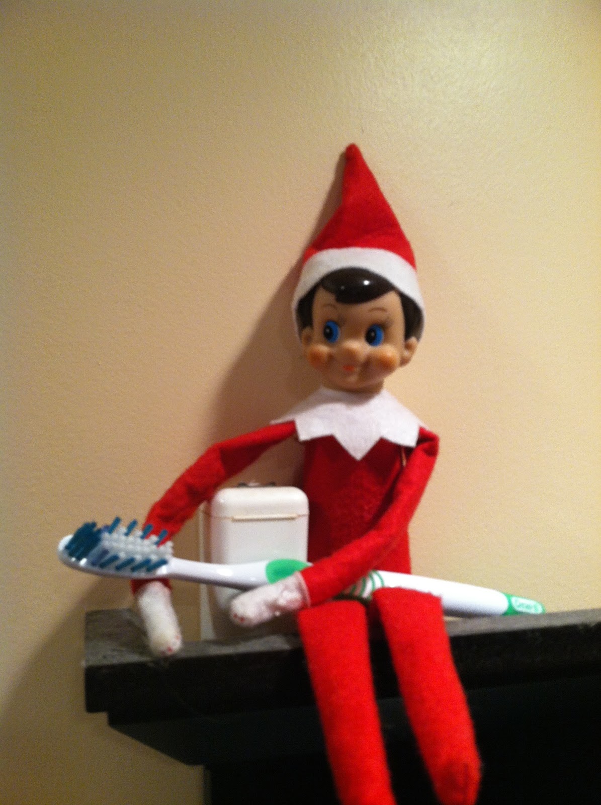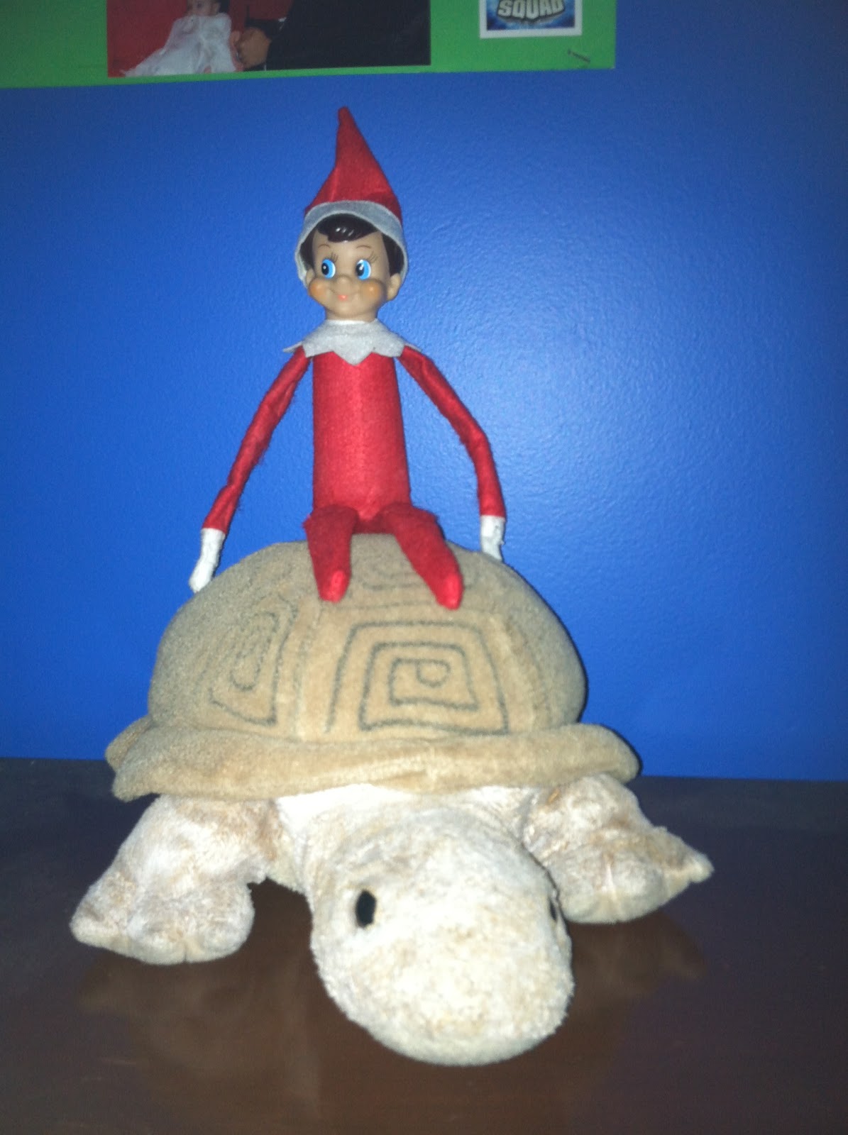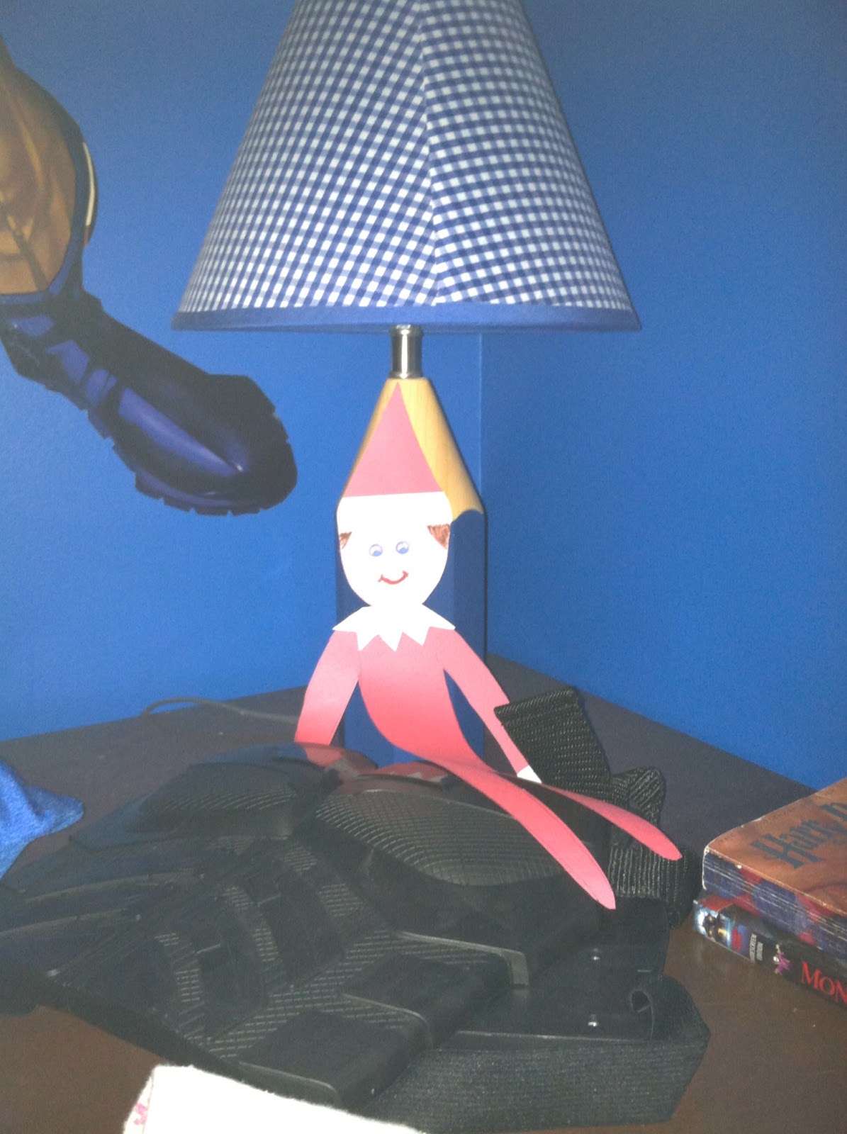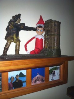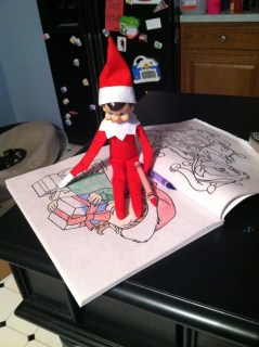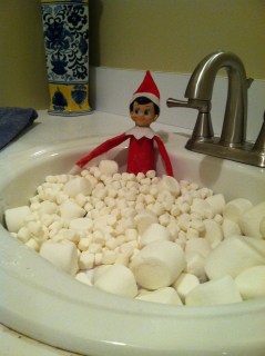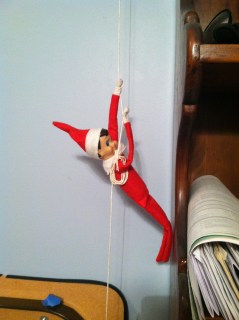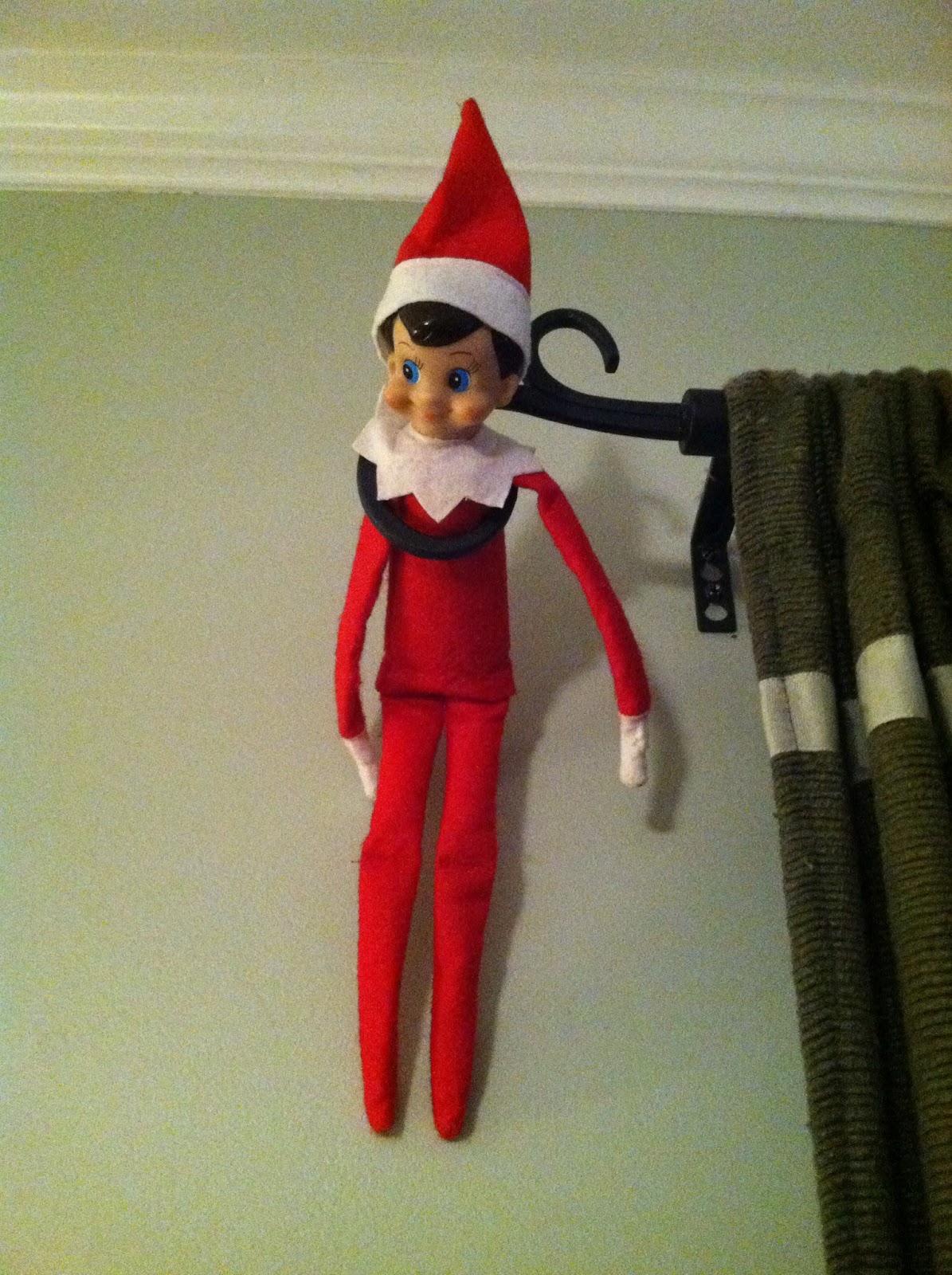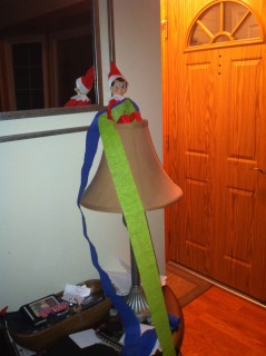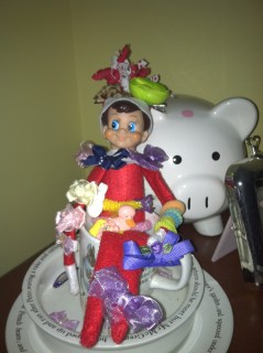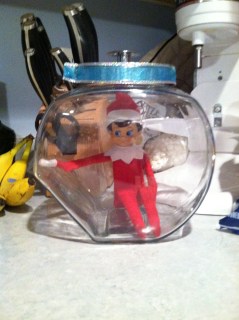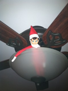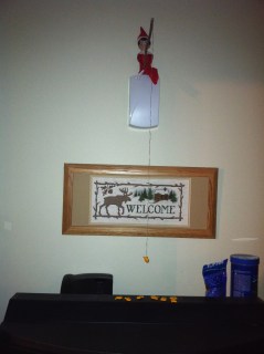 Our Elf on the Shelf arrives the day after Thanksgiving. His name is Buddy. Buddy is one of Santa’s messengers. He comes to visit the kids during the day and then goes back to the north pole at night and reports back to Santa. The next day, Buddy will be found in a different spot. Buddy was a little adventurous and silly this year. Here are all the places the kids found him this year: