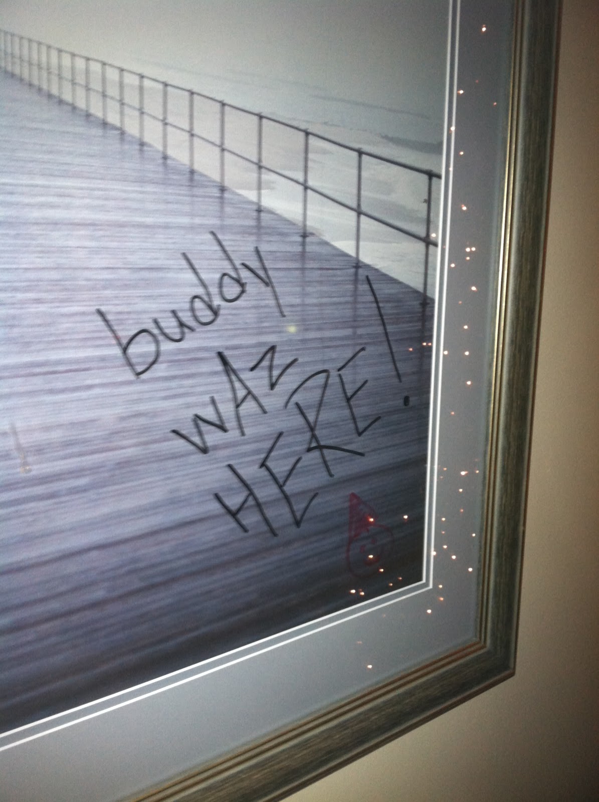 December 12 – Buddy found a marker and made John & Gillian’s pictures look silly. Gillian did not like it all. She kept saying “He make me scary!”