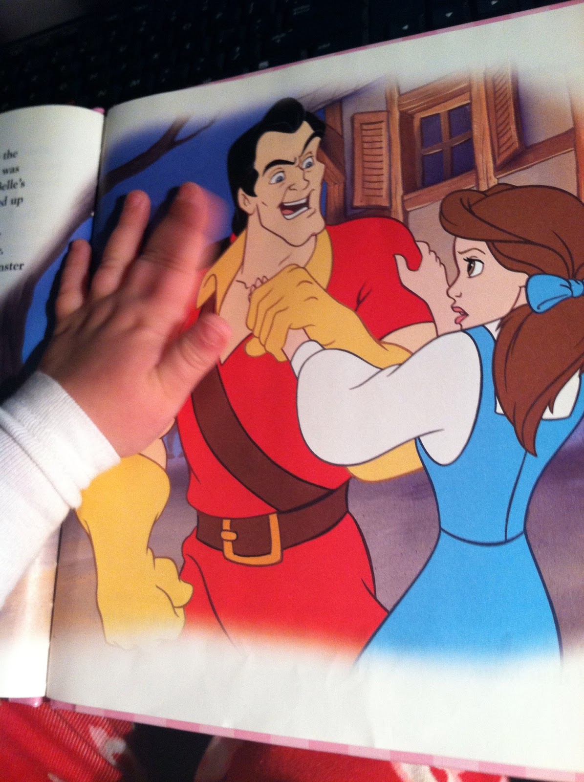 This morning Gillian was reading her princess books. She loves looking at the pictures and occassionally she will comment on what she sees. This morning she was reading “Beauty and the Beast.” She brought the book over to Daddy and pointed to one page and said “He has her hand!” The page she was talking about had a picture of Gaston holding Belle’s hand. She moved to the next page and saw a picture of the Beast. She then said “There a tiger!” Daddy explained to her that he was not a tiger, but he was the Beast. She basically ignored that information. Later she brought the book over to me and again said “He has her hand!’ She was so worried and upset about Gaston holding Belle’s hand. She repeated again and again and again (and again), “He has her hand!” We tried to explain to her that he was the bad guy, and to not worry because Belle was ok. But all she still remains concerned that “He has her hand!”