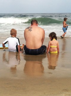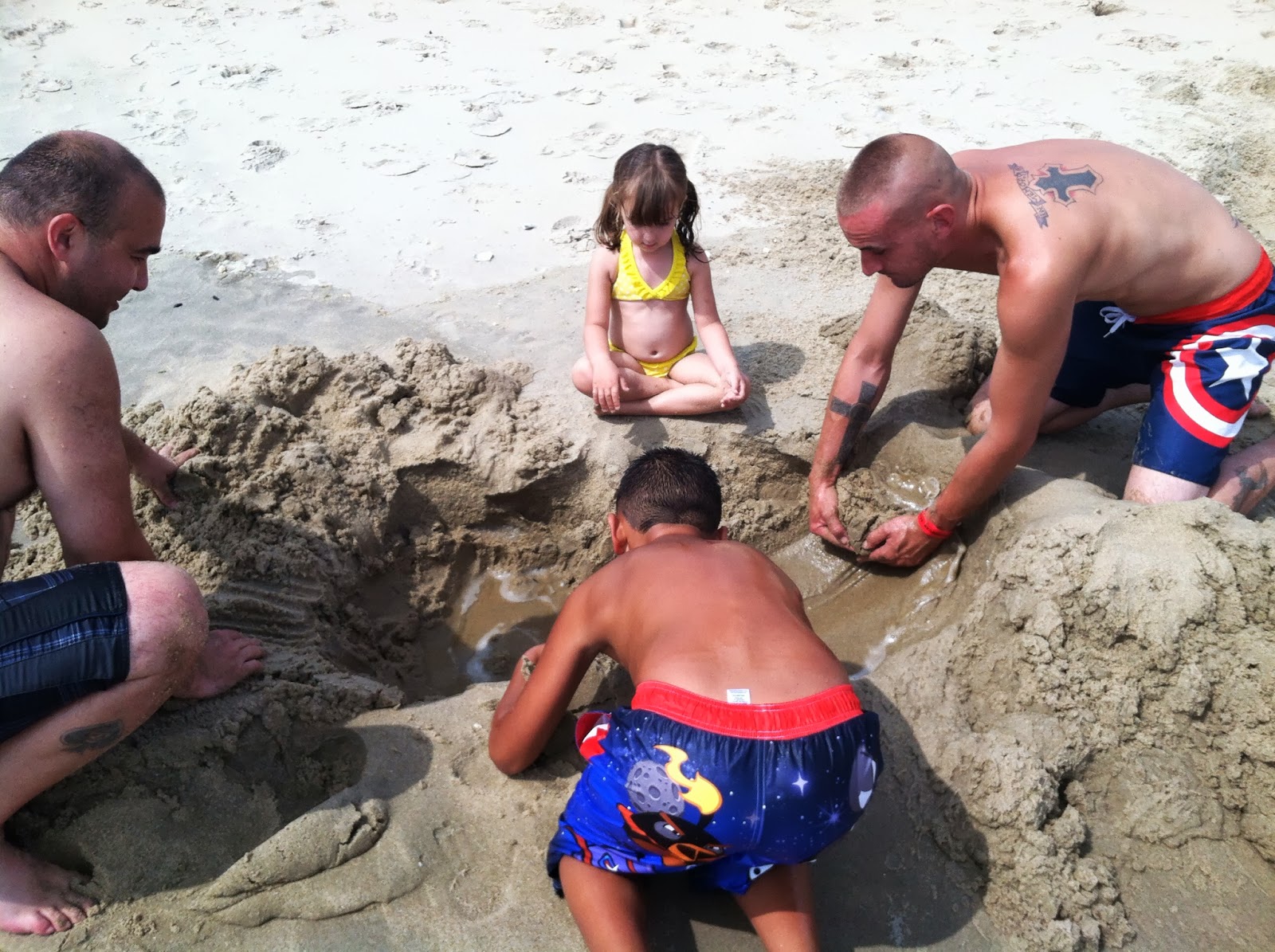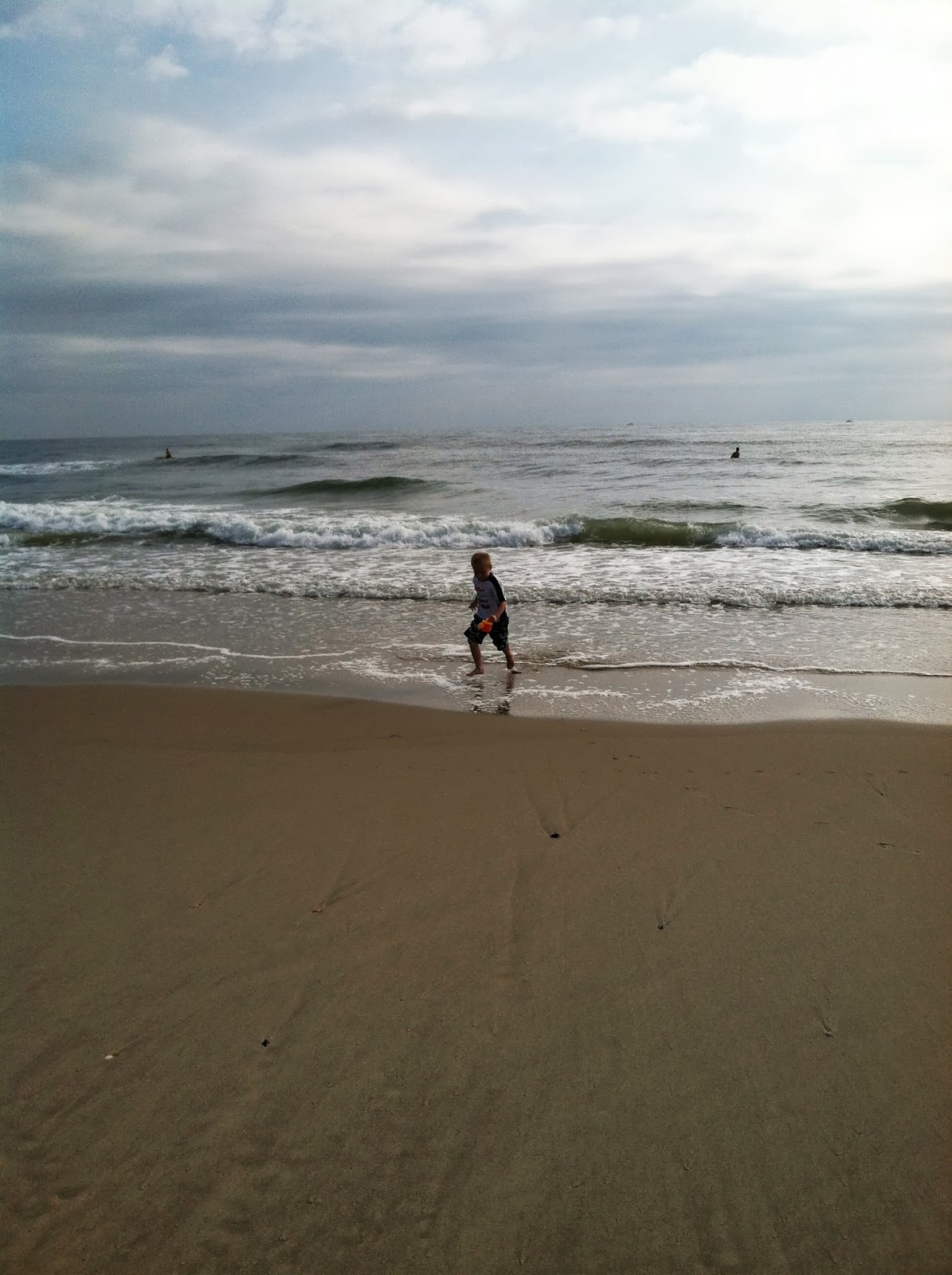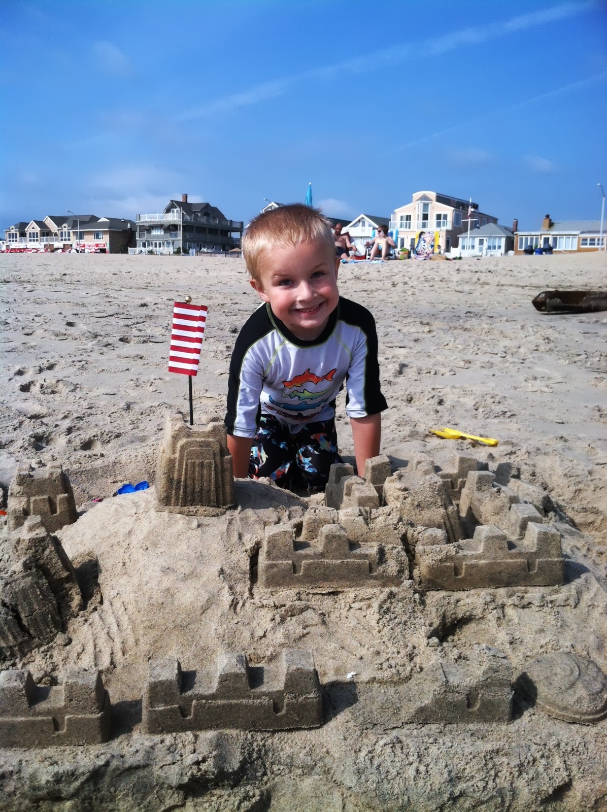 John has been planning on building a sandcastle all week. He wanted his castle to have a moat and towers and a flag on top. We were able to build a nice foundation for his castle along with a moat. But John wasn’t happy. He wanted there to be water in the moat. When that didn’t happen, he got very frustrated. We placed a flag on top of the castle and the kids went back to play in the water. John spent majority of our time on the beach in the water. He jumped over the waves. He punched the waves. He tried to body surf. Uncle Bob and Justin joined us too. When the Justin and Uncle Bob arrived, they joined us in the water. John tried to use Justin’s boogie board, but he fell off very quickly. I think it was because his hands were super pruney from being in the water all day. When he fell off, he went under water. He wasn’t too happy about that, so that was the last time he tried to ride any waves on the boogie board. It didn’t stop him from having Justin pull him on the boogie board in the little waves at the shore.