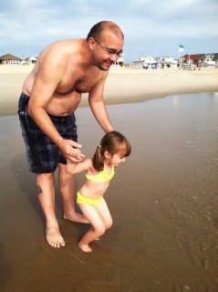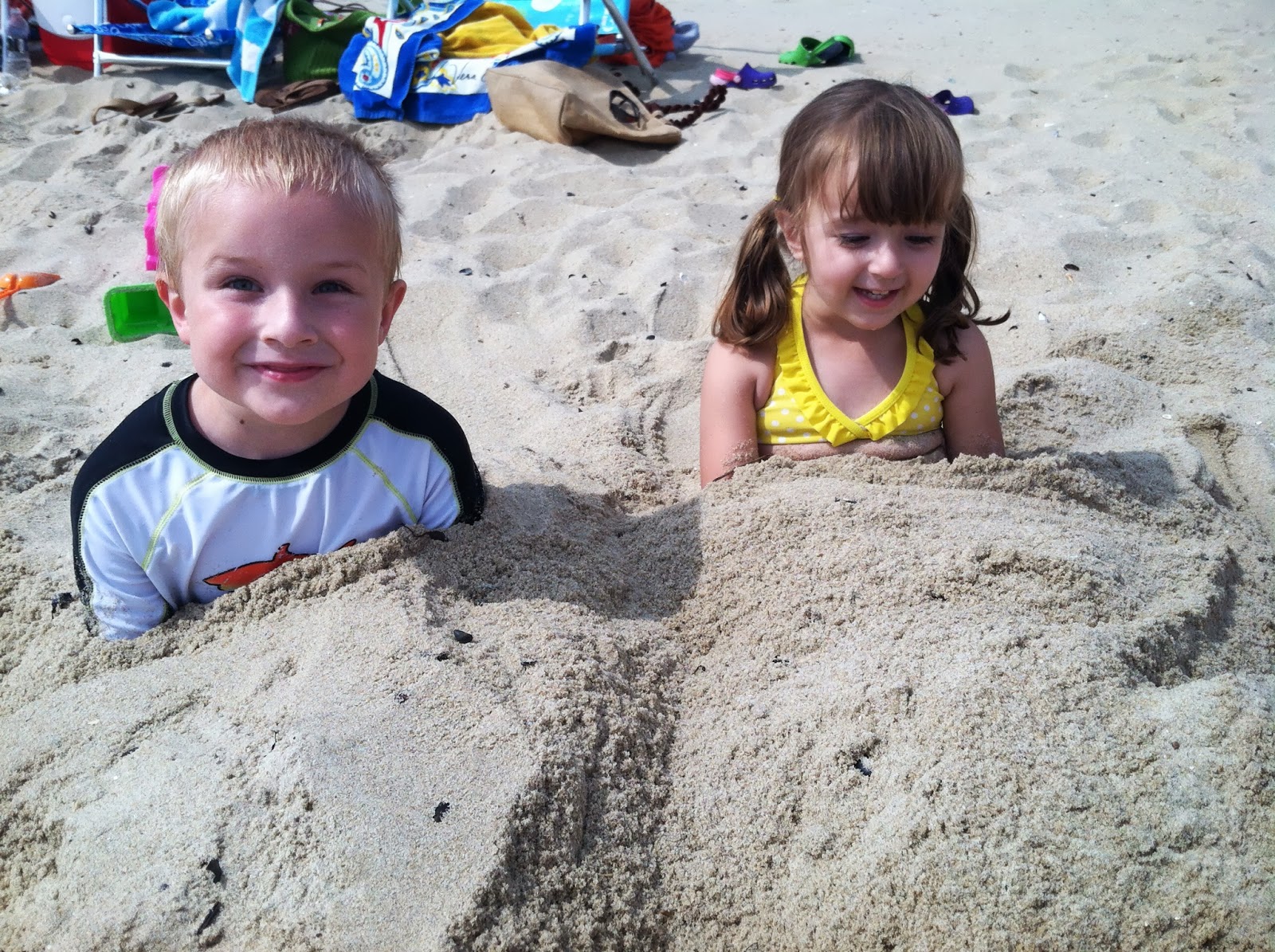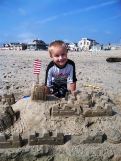 The kids school was closed yesterday, and we decided to take them to the beach. We met Aunt Betty in Manasquan around 9 am. John and Gillian were so excited. They ran down the beach right to the water. Gillian stopped before they reached the water. John, on the other hand, went right into the water. We were only able to get Gillian to put her toes in the water if we were holding both of her hands at the same time. We spent a little bit of time in the water then we started working on a sandcastle.