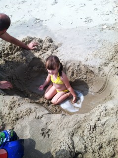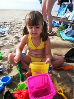 Gillian got Uncle Bob to make her a little pool. She loved watching everyone dig for her, but refusted to go into it until it was “full.” Luckily the waves helped with that and in no time she had water in her little pool.