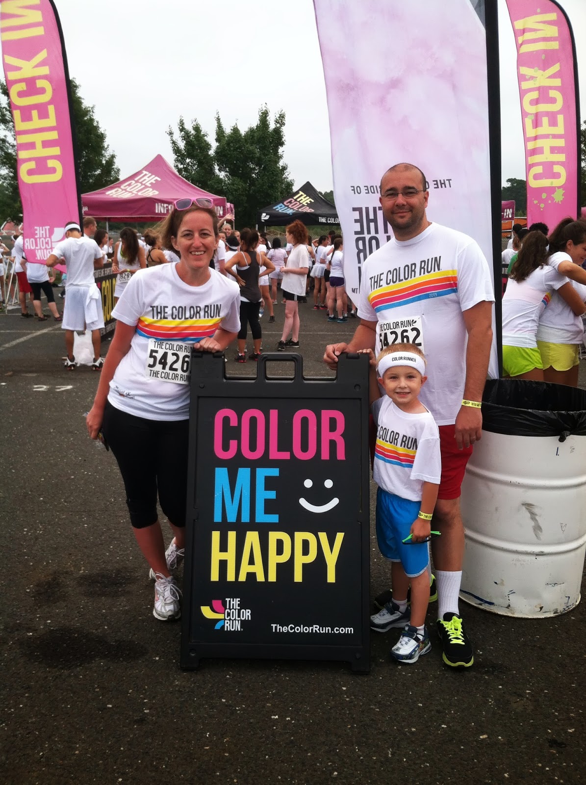 In the car, he kept asking Daddy “Are we there yet?” “I think we are going to be late.” We finally pulled into the lot and saw Aunt Betty and her friend Ali. We pinned on our numbers and headed to the starting line. John was not happy about taking pictures before the race. He was very anxious to start.