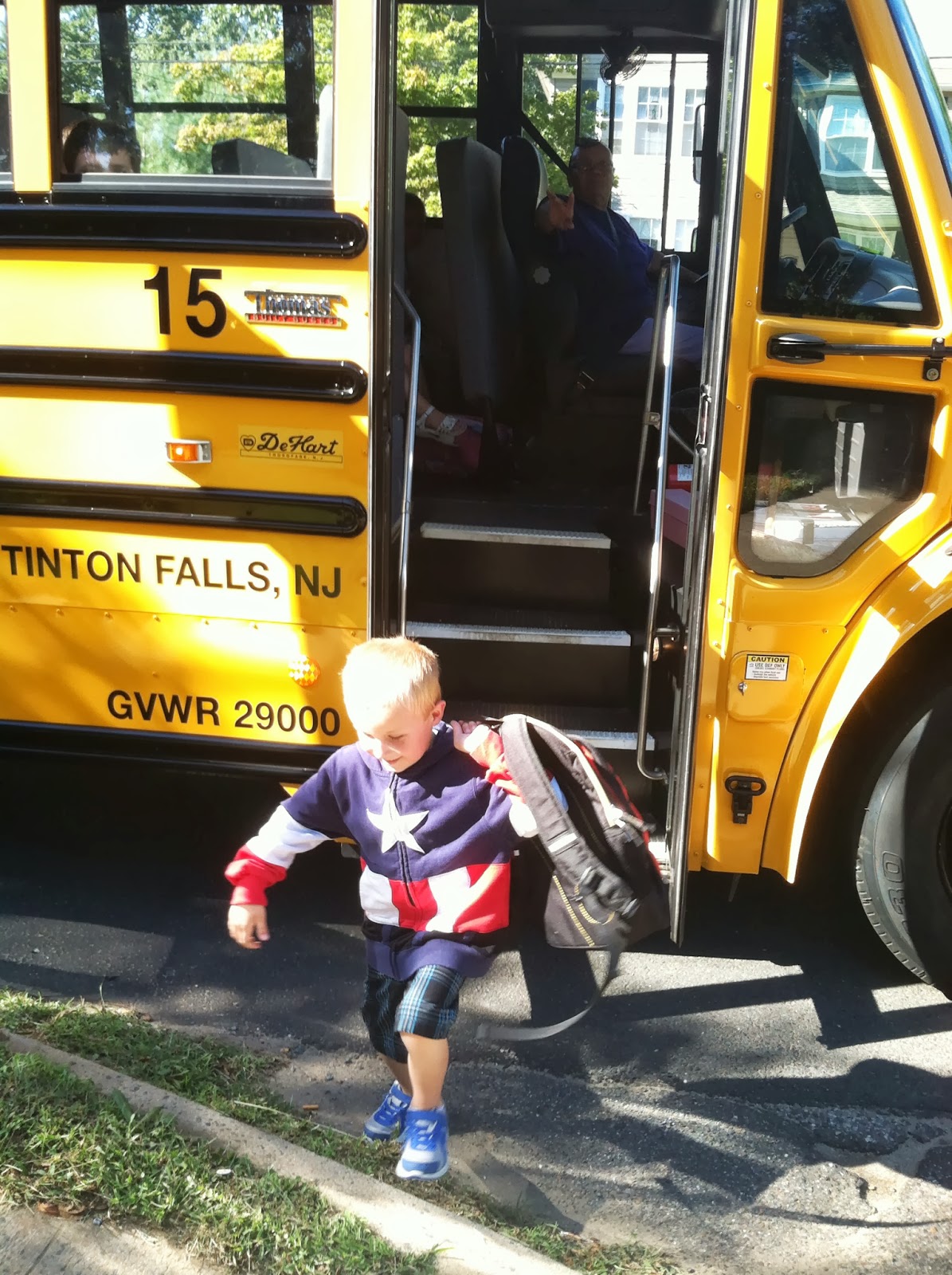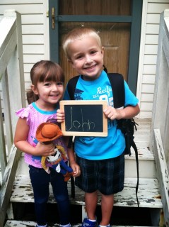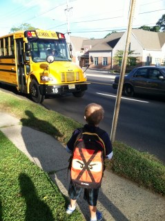 Finally it was time to go to the bus stop. John, Gillian, Daddy and I headed to the bus stop. John was very excited and didn’t want to wait. He paced. For awhile we played I Spy. That entertained him. Gillian got mad, because we didn’t ask her to pick something. When we finally let Gillian have a turn, she picked something so obvious. It was hilarious. Before we realized it, the bus was arrived. John didn’t hesitate and climbed the stairs and sat in the seat behind the driver. The bus was barely past our street, and Gillian started to cry. “Where Johnny going?” She shed a few tears and I gave her a hug. We walked back home and I explained to her that John was taking the bus to his new school. She calmed down and I took her to school. After I dropped off Gillian, I drove past John’s new school (I know, I’m a little crazy.). There were tons of buses and people dropping off kids. I couldn’t see John, but it made me feel better.