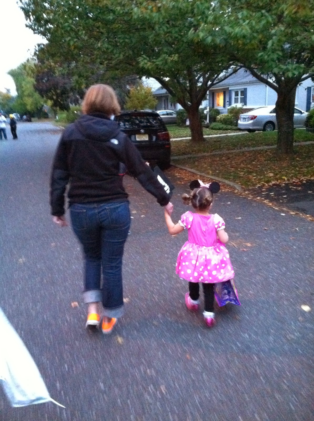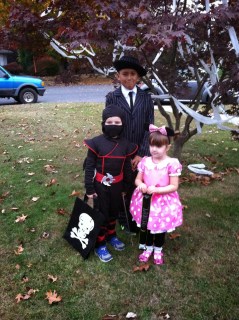 We picked up the kids from school and headed to my mom’s house for trick-or-treating. We stopped for a quick picture in front of Grandma’s house and then we were on our way. Gillian stayed behind the boys at the first house. Since Sandy ruined Halloween last year and the year before that she was too small to really understand anything, it was Gillian’s first real year for trick-or-treating. It didn’t take her long before she was running ahead of the boys to get to the next house. She was polite and always said “Thank you!” We were about five houses from Grandma’s when I realized that we should change her shoes. She was wearing her little Minnie Mouse pumps and they were really slowing her down. I finally got her to change into her sneakers, about two blocks later. She is a very determined little lady.
