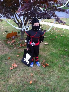 John, on the other hand, wasn’t allowed to wear his Ninja costume to school. He had to bring it to school and then the kids all got dressed in their costumes before they had an indoor parade. Luckily, John’s costume wasn’t hard to put on and he really didn’t need a lot of assistance. He told me that they also had a party with snacks and each of the kids in his class got to decorate a little pumpkin.