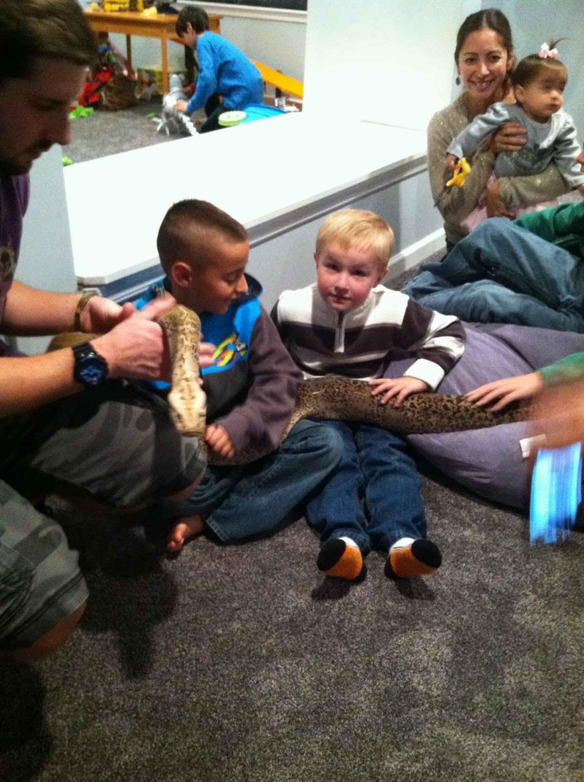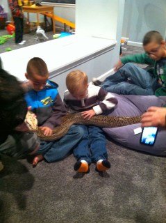 Finally it was time for the last animal. Mr. Joe asked for some help from a couple of the dads. They stood there while Mr. Joe put a huge constrictor in their arms. It wasn’t a boa constrictor. I don’t remember the type, but he was a constrictor. The snake was really big. John stayed in the back of the room with me. He kept whispering “I’m not going to touch him. I’ll stay with you.” Mr. Joe let the boys hold the snake by laying the snake down on their laps. After a few rows of boys got to hold the snake, John got closer and closer. Finally it was only the parents and a couple of kids left in the basement, and John was brave enough to get close. I am so proud of him. He faced his fear and held the snake.