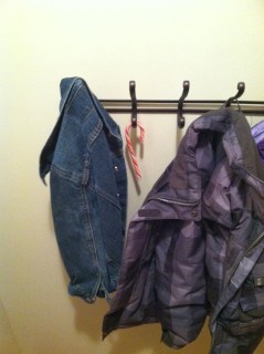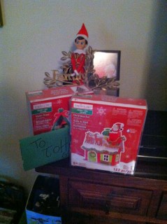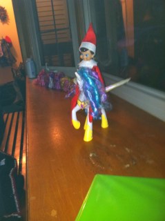 Thursday morning, Buddy wasn’t hiding. He was sitting on a table in the living room. He was sitting in a Barbie chair (“Him’s always takes my toys!”) and he had a little note. The note said “I have hidden 10 candy canes. Can you find them?” The kids had so much fun running around the living room looking for the candy canes.