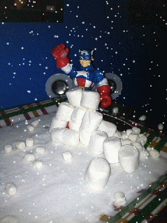 The following day, we found Buddy in John’s room. Buddy was having a snowball fight with Captain America! Mommy was happy that Buddy kept all the sugar and marshmallows on a tray and not on the dresser!