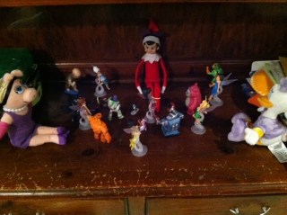 On Tuesday, December 3rd, we found Buddy with all the new toys that John and Gillian got on their trip. Buddy was still wearing his Mickey ears. Daddy and I think that Buddy was asking the toys if the kids were good on their vacation.