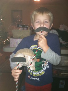 Saturday morning, December 21st, John found Buddy in the living room. But Buddy looked different! “He’s got a mustache! And he made us mustaches! He must really like us.” We had a lot of fun with the mustaches (even Travis the turtle)!
