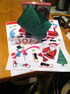 On Saturday morning, John found a little note from Buddy along with a movie and some window clings. He had a hard time finding Buddy, but Gillian spotted him right away. “Him’s up there!” And there he was on top of the curtains in the kitchen.