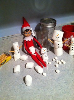 On Friday, December 6th, the kids found Buddy in the kitchen. He was making marshmallow snowmen! John said “Mommy! He is using your food markers!”