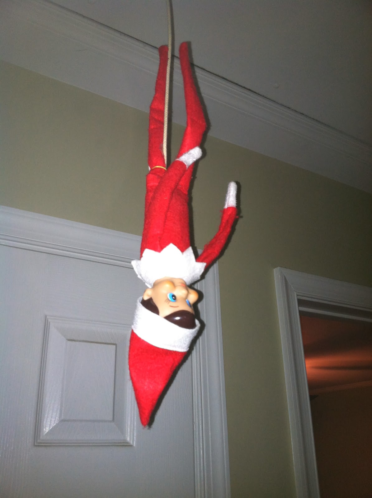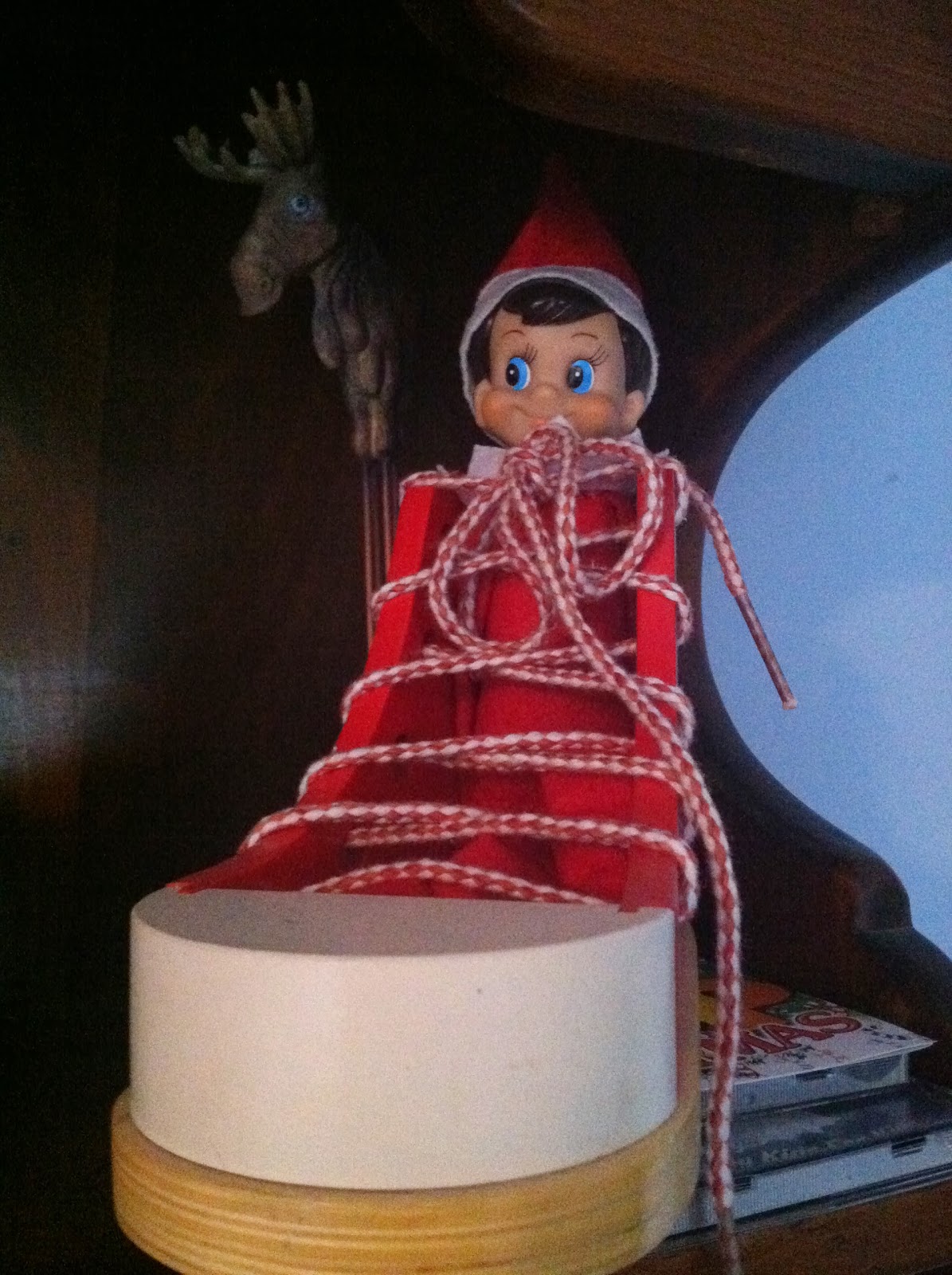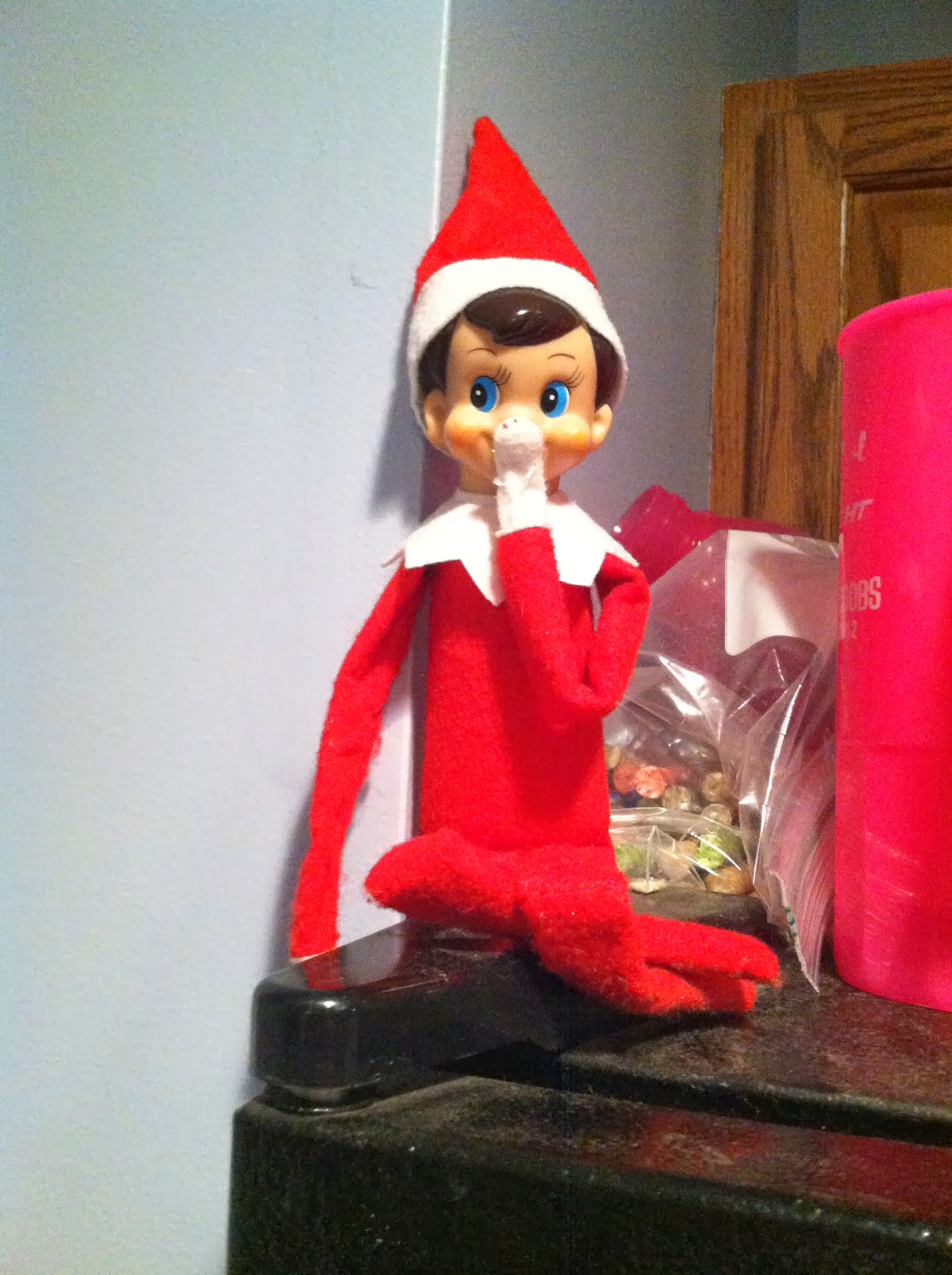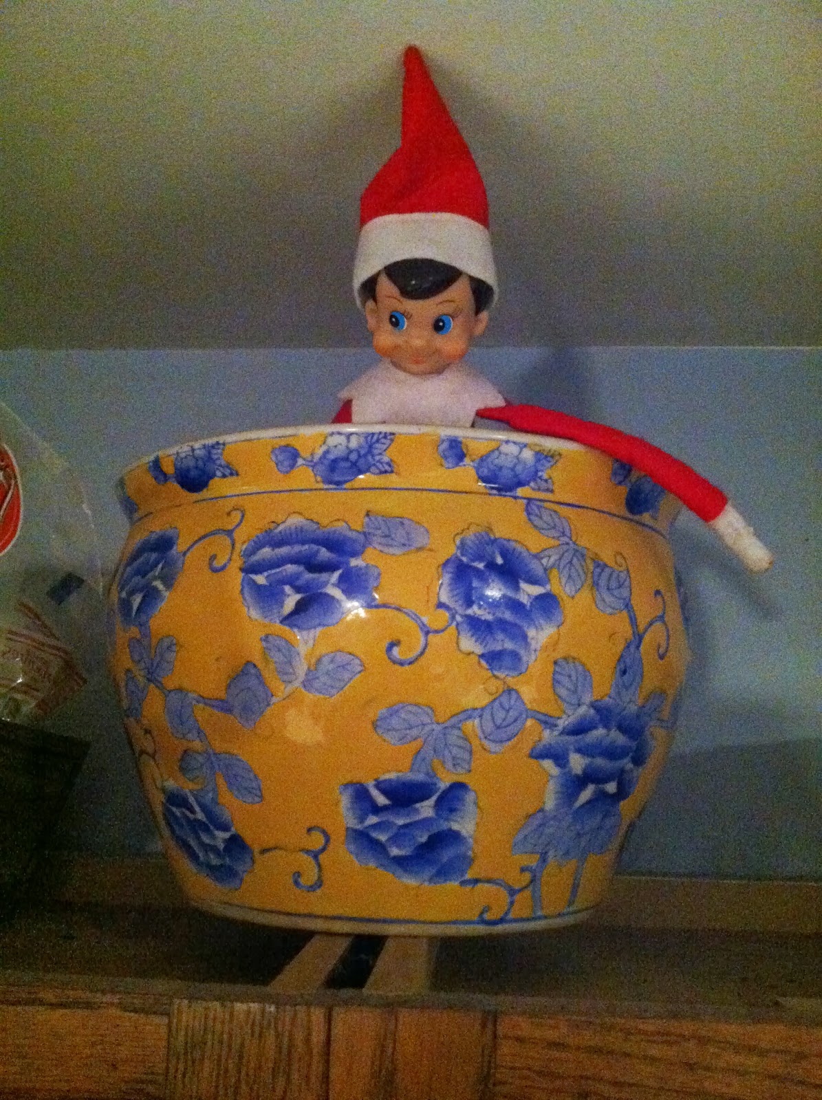 The kids spent the night at Grandma’s on Saturday, December 14th and when I picked them up on Sunday, they immediately asked “Where’s Buddy?” “Did you see him?” When I said “No.” John said “Did you see anything unusual?” I love that they were excited to see what Buddy was up to. We found him when we got home. He was just chilling in a jar on Mommy’s cabinets.