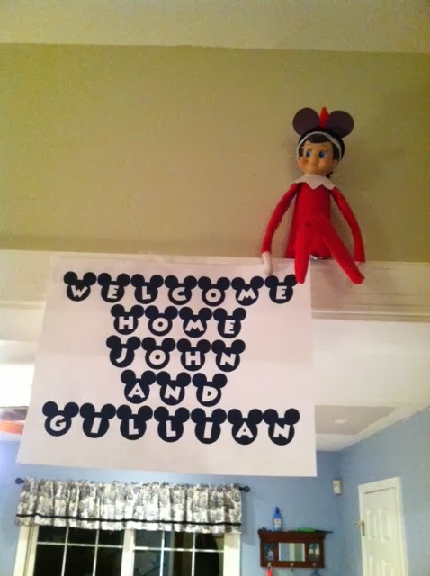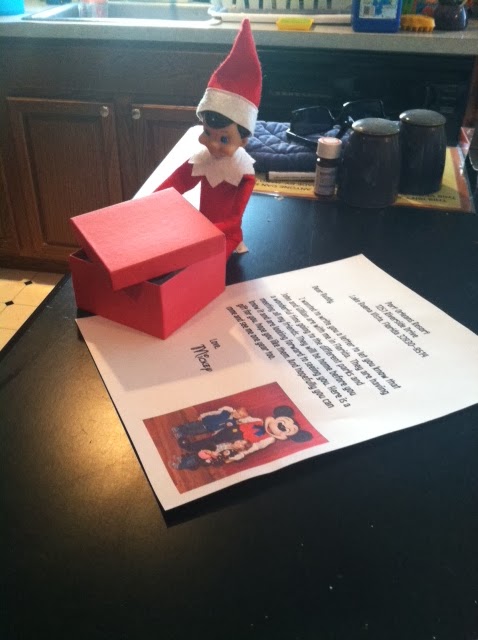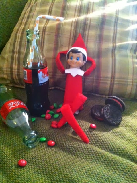 Our Elf on the Shelf, Buddy, returned the day after Thanksgiving. When we were in Disney World, I asked Aunt Betty to check our mail for us. She went to the house the Friday after Thanksgiving and found Buddy sitting on the couch eating M&Ms and Oreos and drinking soda. She took a picture and sent it to me.