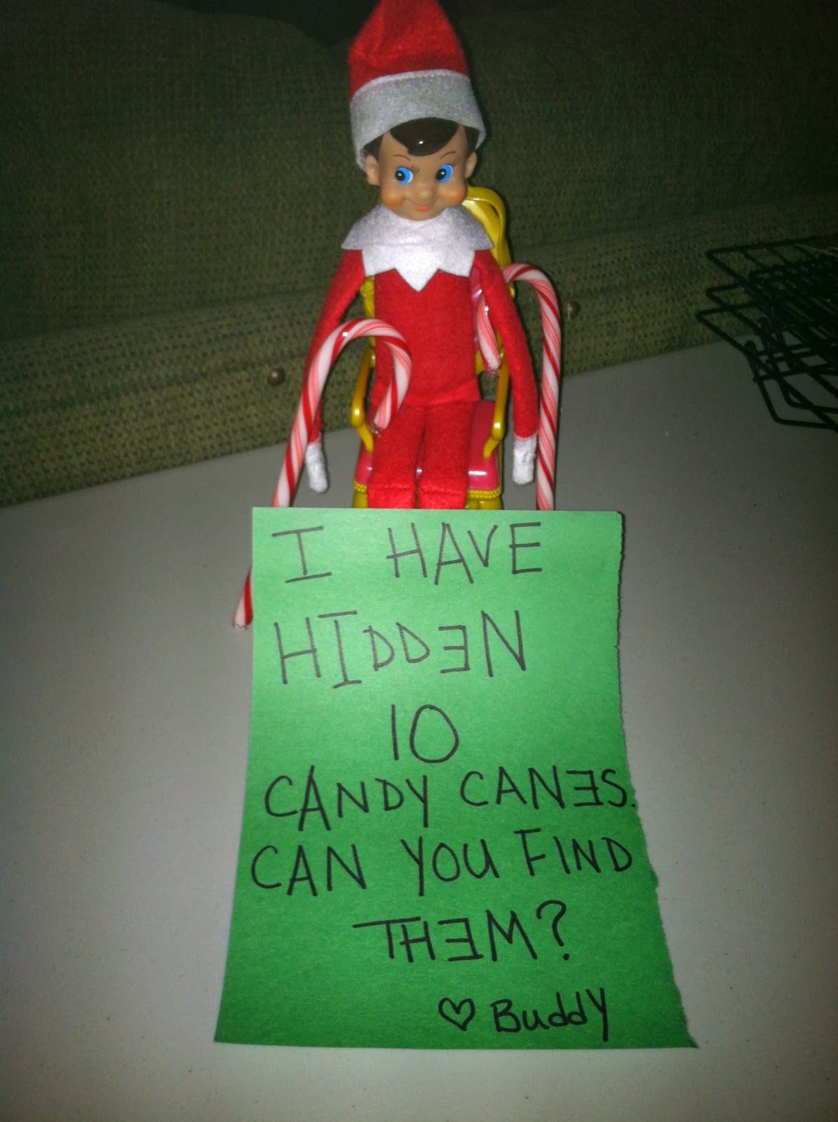 Thursday morning, Buddy wasn’t hiding. He was sitting on a table in the living room. He was sitting in a Barbie chair (“Him’s always takes my toys!”) and he had a little note. The note said “I have hidden 10 candy canes. Can you find them?” The kids had so much fun running around the living room looking for the candy canes.