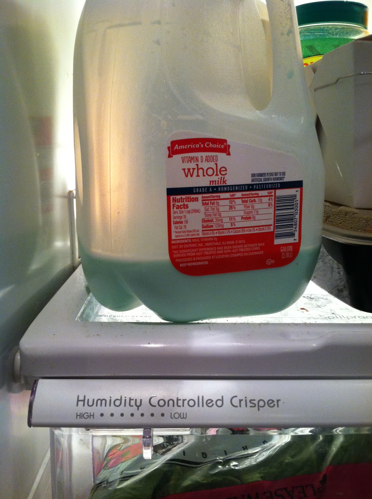 On Monday morning, the kids found Buddy sitting on top of the refrigerator. He had his hand covering his mouth. I thought he looked like he was hiding a smile. John wasn’t sure. The kids decided to have cereal for breakfast and when John went into the fridge to get the milk. He pulled it out and said “I think it’s bad!” The milk was green! I told him, “It’s not bad. Buddy got into Mommy’s food dye. Remember I was decorating cookies last night.” John was unsure about using the green milk, but not Gillian!
