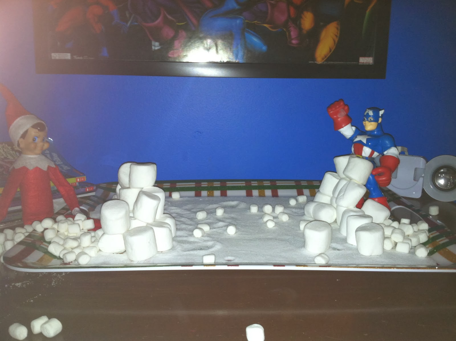 The following day, we found Buddy in John’s room. Buddy was having a snowball fight with Captain America! Mommy was happy that Buddy kept all the sugar and marshmallows on a tray and not on the dresser!