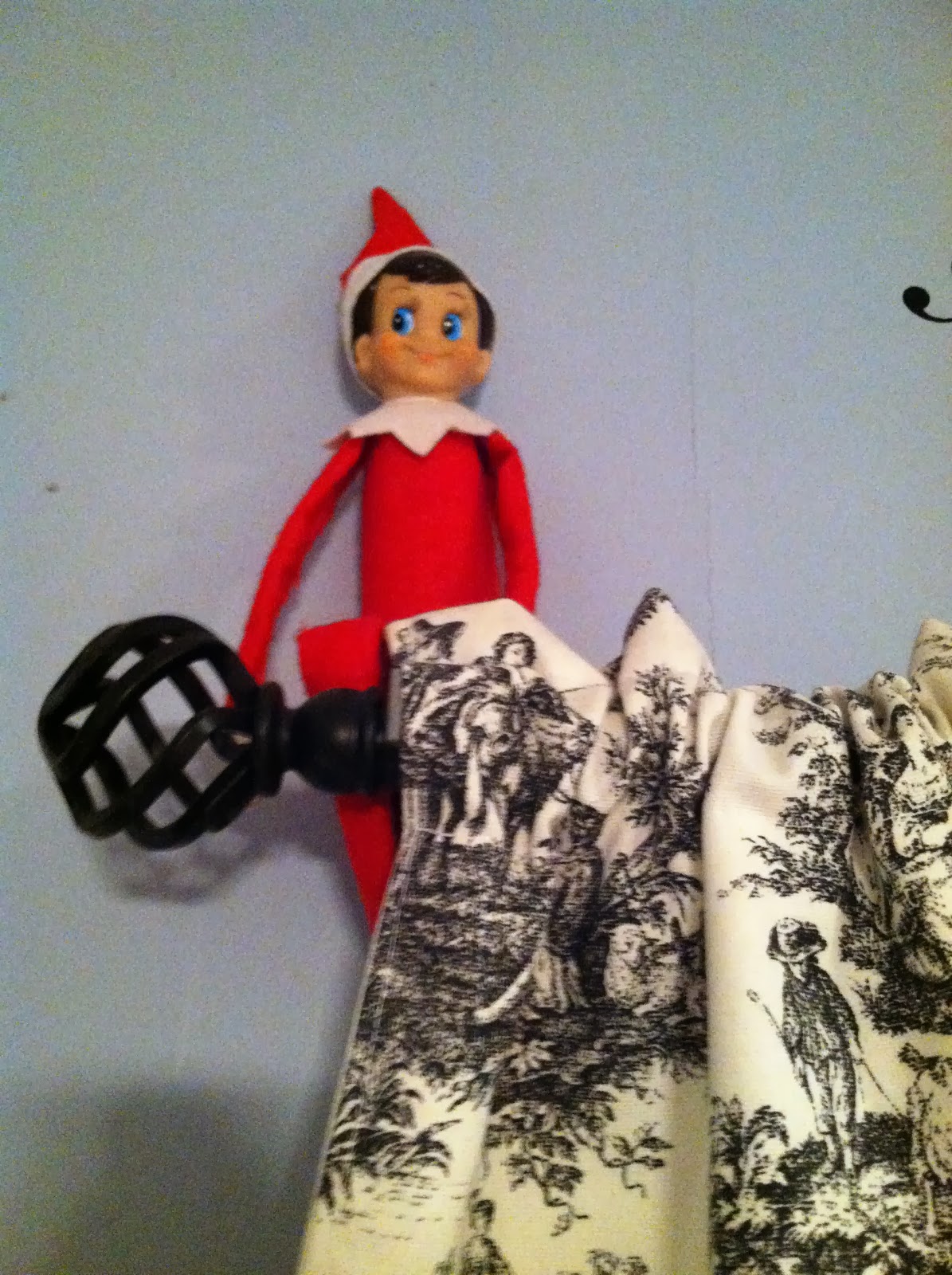 On Saturday morning, John found a little note from Buddy along with a movie and some window clings. He had a hard time finding Buddy, but Gillian spotted him right away. “Him’s up there!” And there he was on top of the curtains in the kitchen.