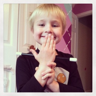 Later he found me in Gillian’s room, “Mom! I need quarters! Two of them! I’m learning a new trick!” I told him where he could find quarters and he ran away. He came back later with a magic wand. I asked him, “Did you find the quarters?” He said “Nope, I learned a new trick!” He then showed me how he could float the wand in the air.